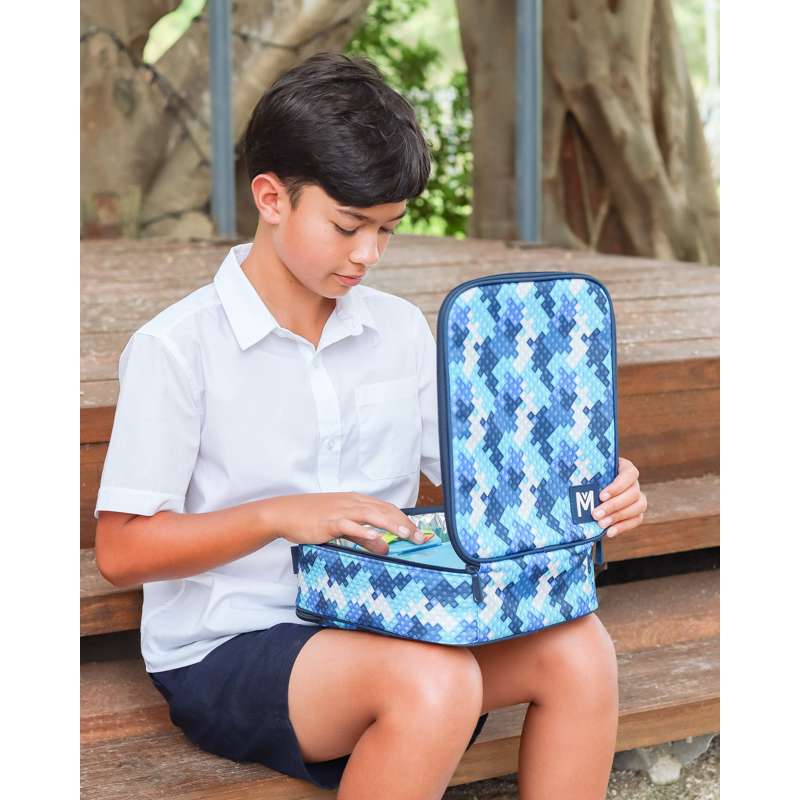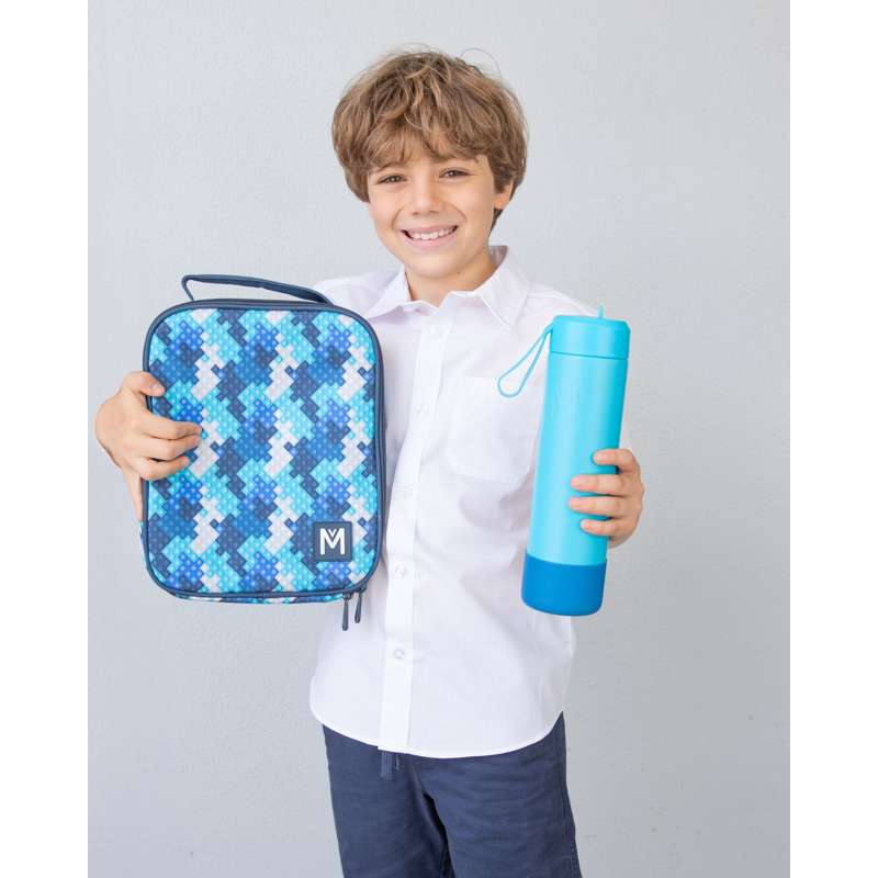 Hold madpakken frisk og lækker hele dagen med den skønne MontiiCo køletaske i designet Block Land. Den fine blå taske har et tetris lignende mønster og perfekt til børn der elsker computerspil - perfekt til skole, børnehave og ture på farten.