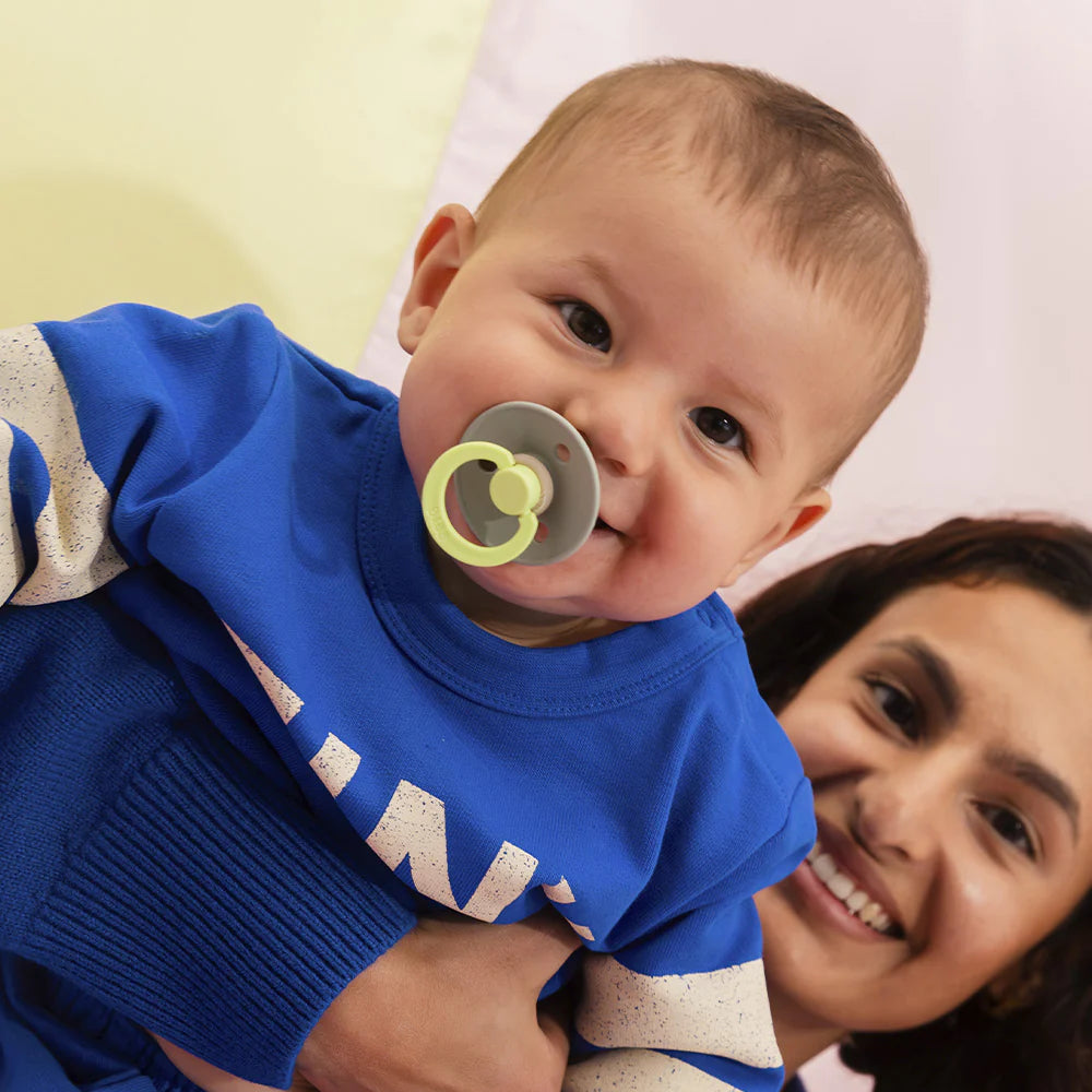 2 styks runde sutter, lavet i naturgummilatex og med et rundt skjold, som er designet således, at der er mindst mulig kontakt med babyens hud, som nedsætter sandsynligheden for fugt og udslæt omkring næse og mund.