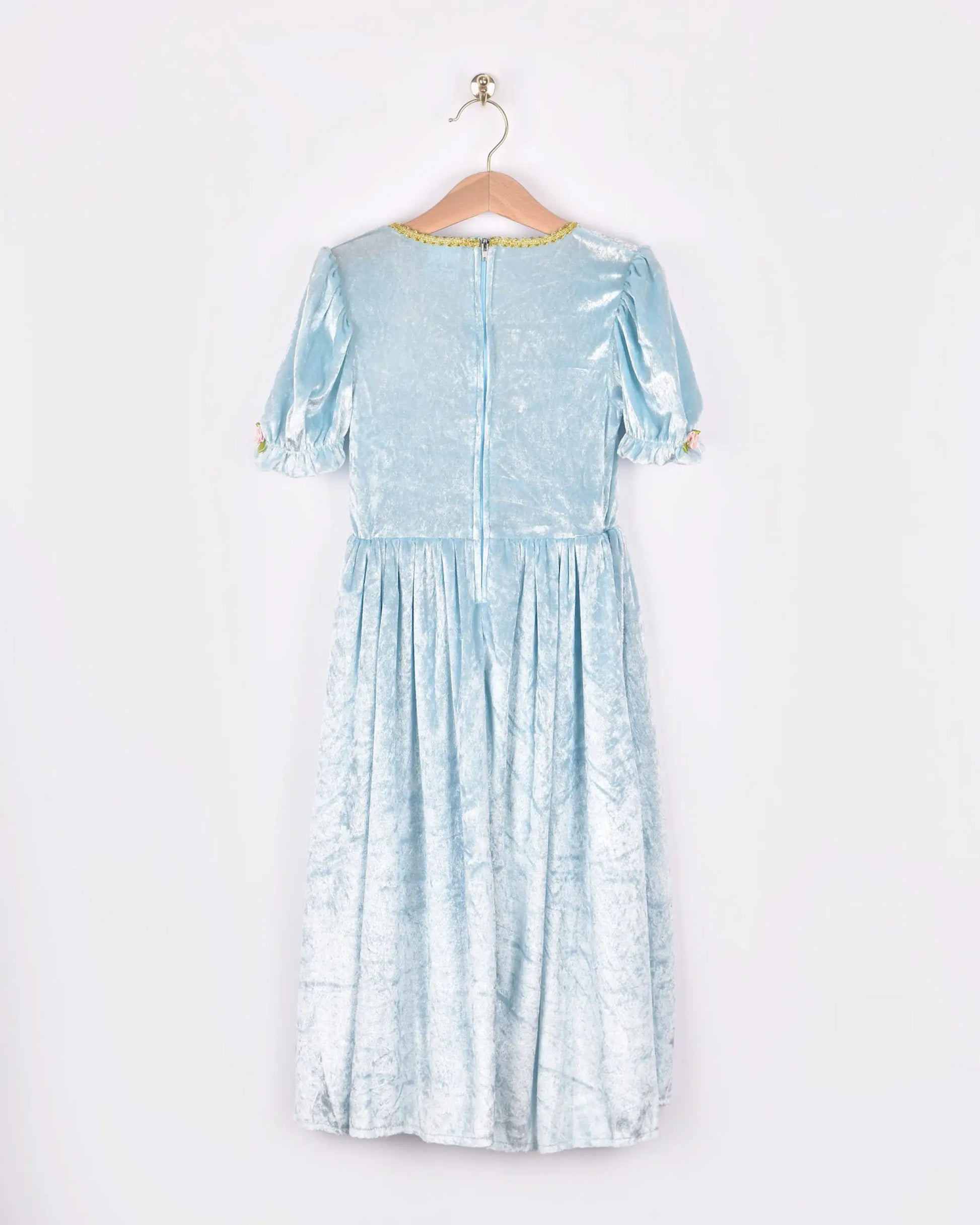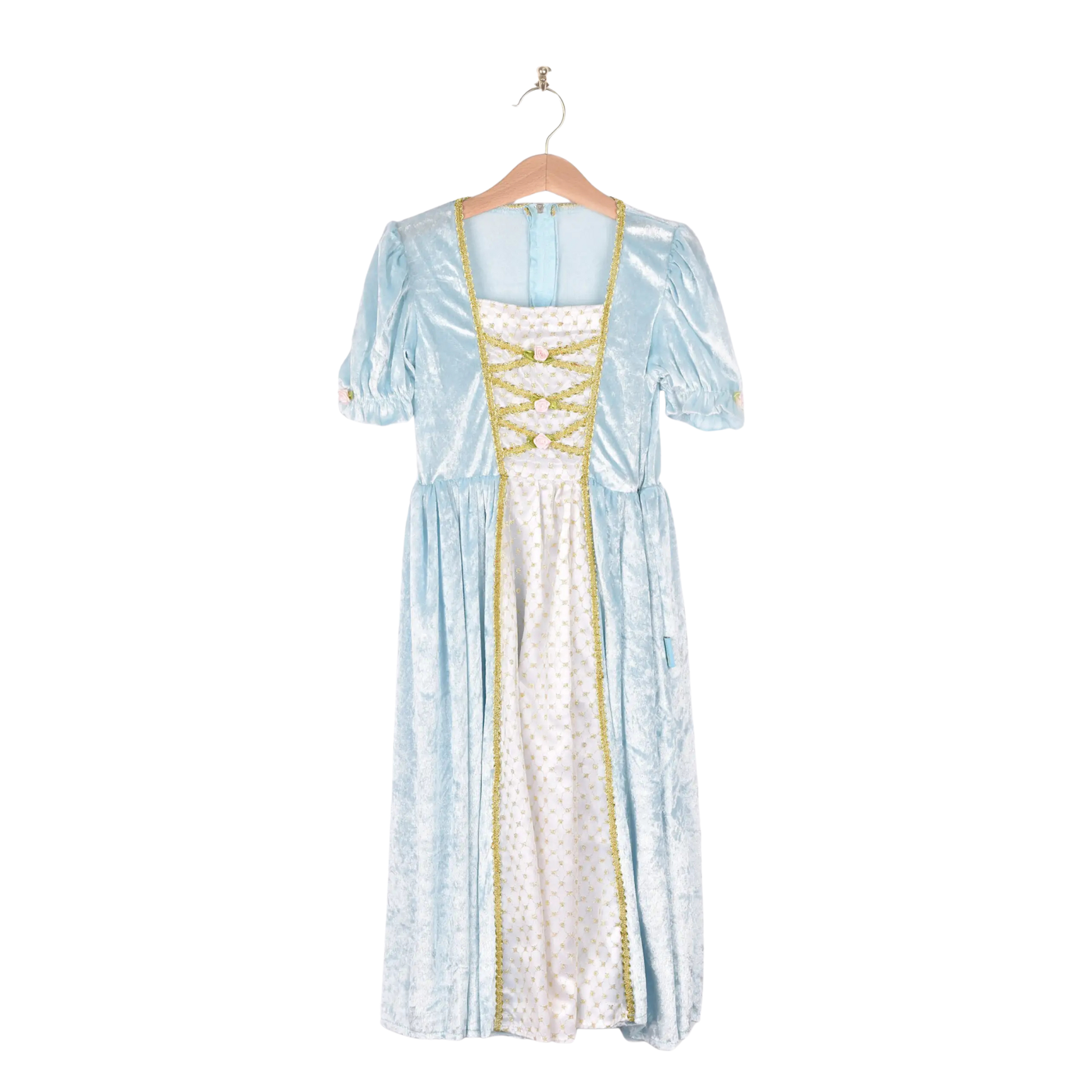 Træd ind i et eventyr med denne prinsessekjole lavet af blå og blød velour og med smukke gulddetaljer. Kjolen er perfekt til fantasifuld rolleleg, fastelavn eller enhver dag, hvor barnet vil føle sig som ægte prinsesse.