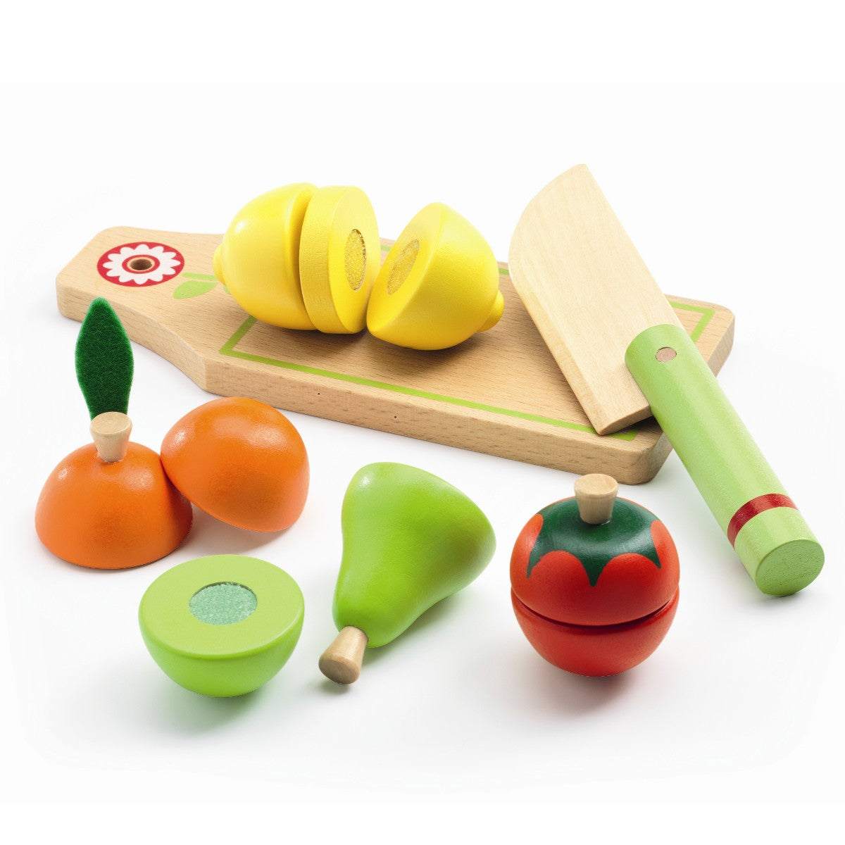 Super flot sæt med populært trælegemad med velcro. Der medfølger trækniv samt skærebræt, så frugten/grønsagerne kan skæres over.