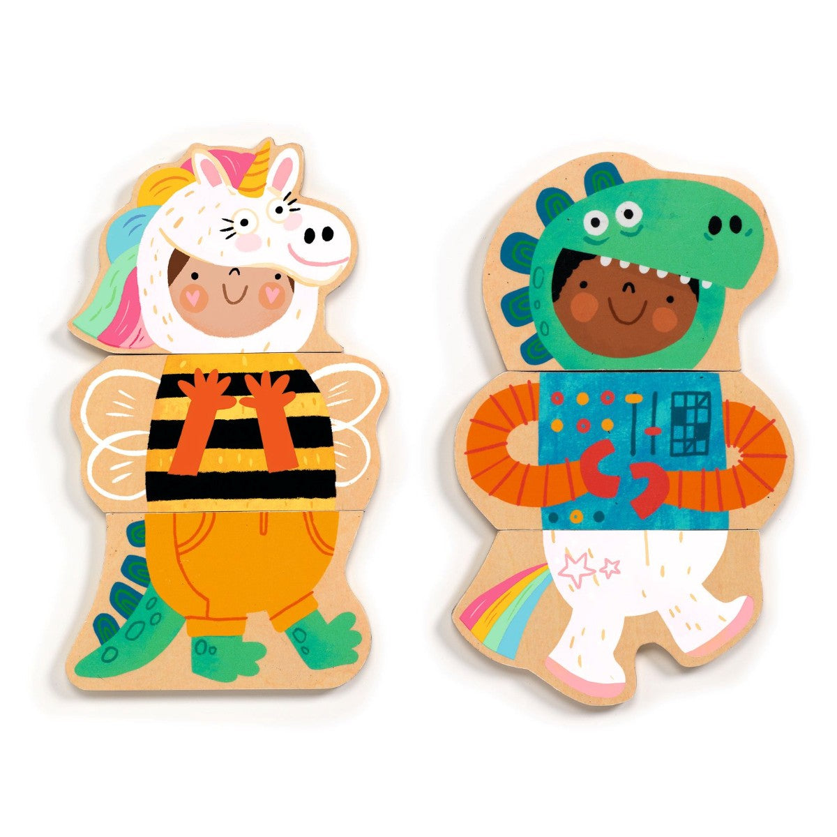 I denne sjove pakke magneter fra Djeco, kan du sammensætte de søde børn i udklædningstøj på forskellig vis. De 8 forsekellige figurer består hver af tre dele - et hoved, en krop samt ben. Sæt dem sammen på rigtig vis eller skab dine helt egne fjollede figurer. 24 dele i alt.