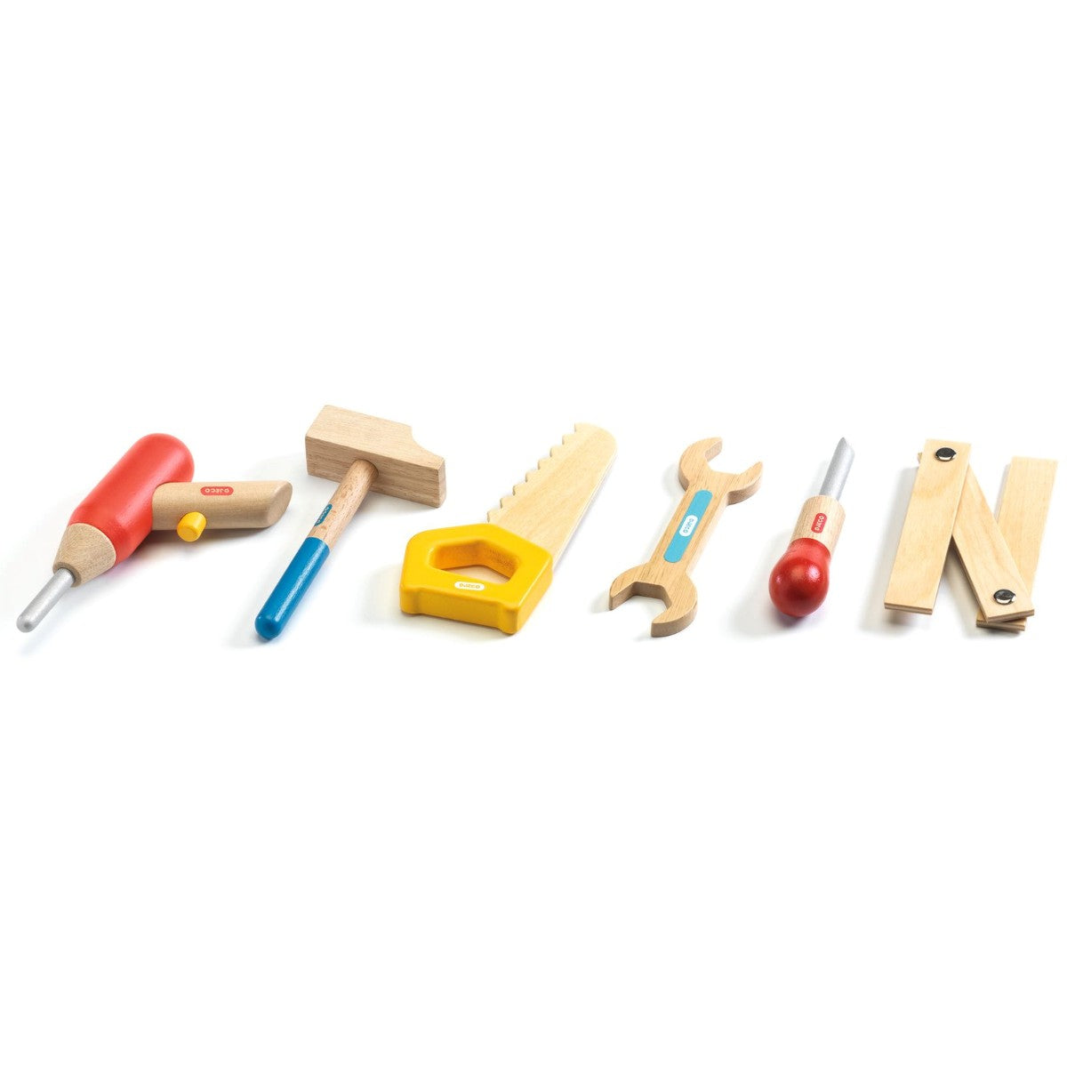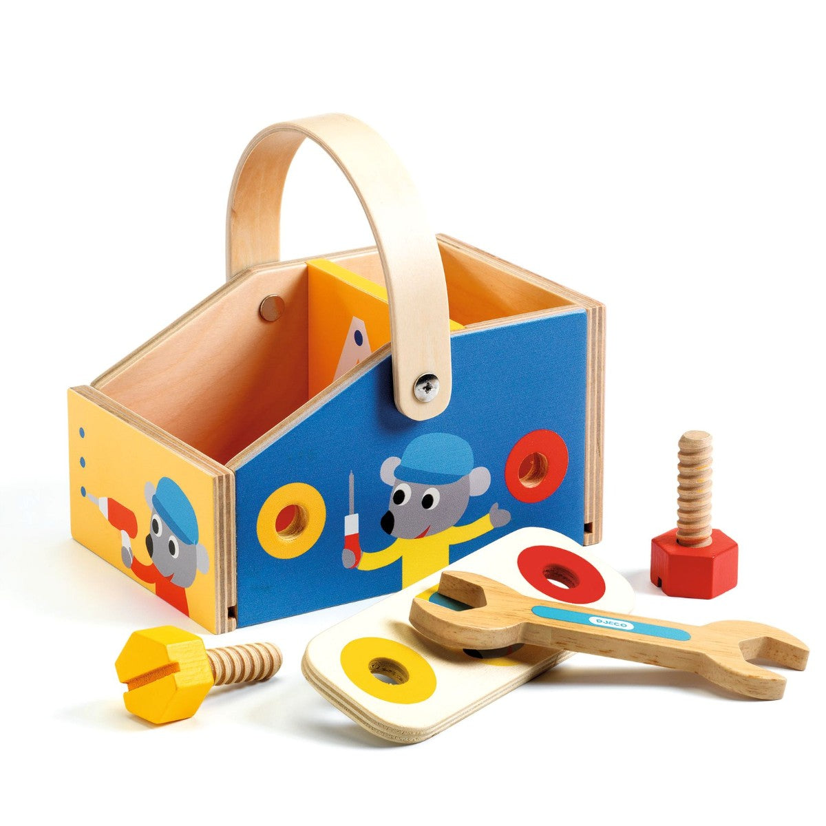 Med denne flotte værktøjskasse i træ fra Djeco kan du blive en rigtig lille handyman når der er noget der trænger til at blive repareret. Motorikken øves, når de store skruer/bolte skal skrues i pladen. Det hele opbevares nemt i den praktiske kasse med bærehåndtag.