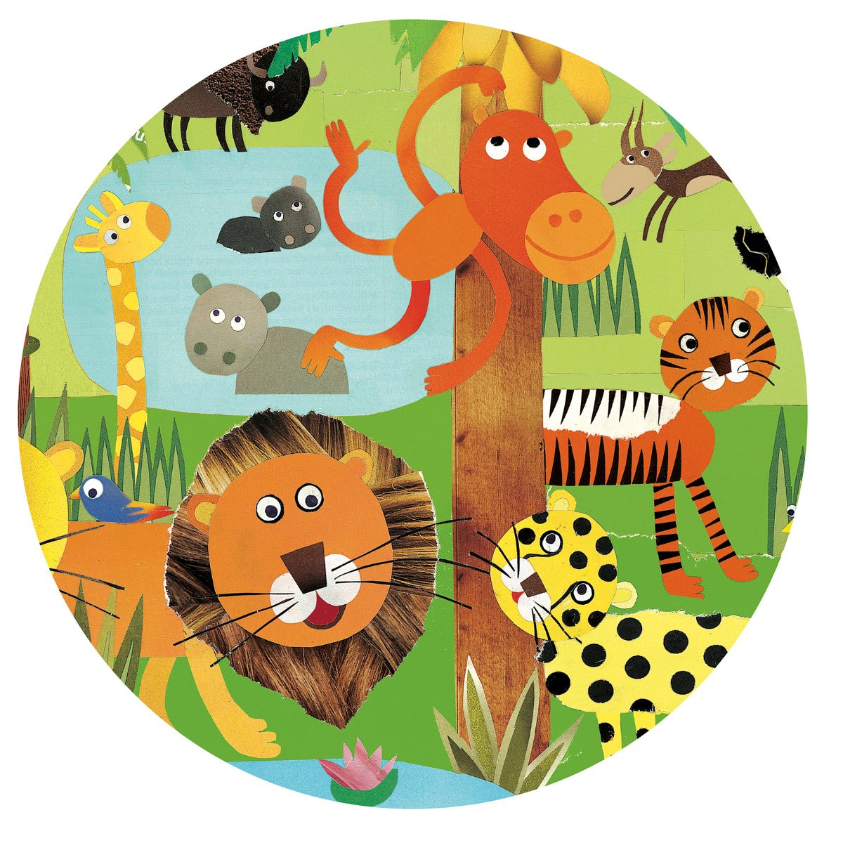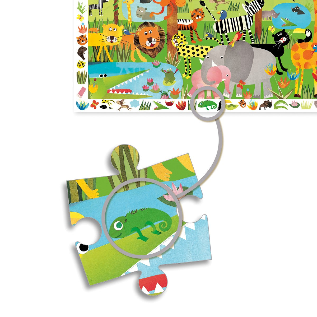 Flot observationspuslespil, med et fint motiv fra junglen og alle dens vilde dyr. Gå på opdagelse i puslespillet og se om du kan finde de mange forskellige enkelte billeder der er rundt på puslespillets kant, i selve puslespils motivet.