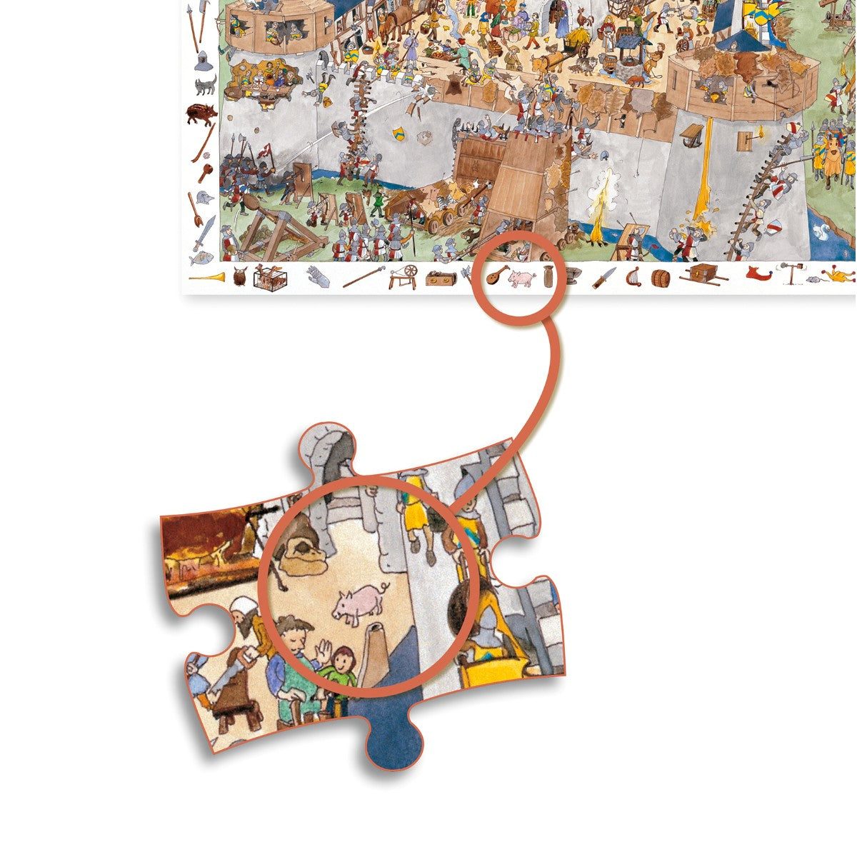 Observationspuslespil fra Djeco med 100 brikker. Når puslespillet er lagt, skal man i motivet, finde de mange små motiver, der er tegnet rundt i rammen.
