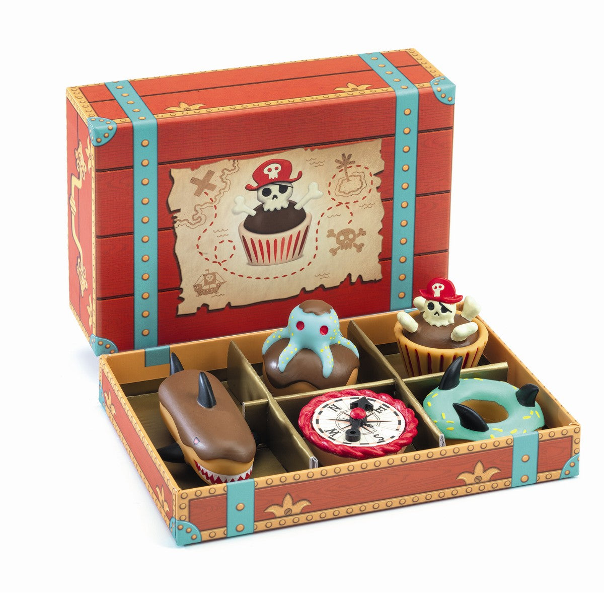 En flot æske fuld af de sejeste piratkager, uundværlige når der skal leges med legemad. Perfekt til kagebordet eller hvis der skal laves kagesalg.