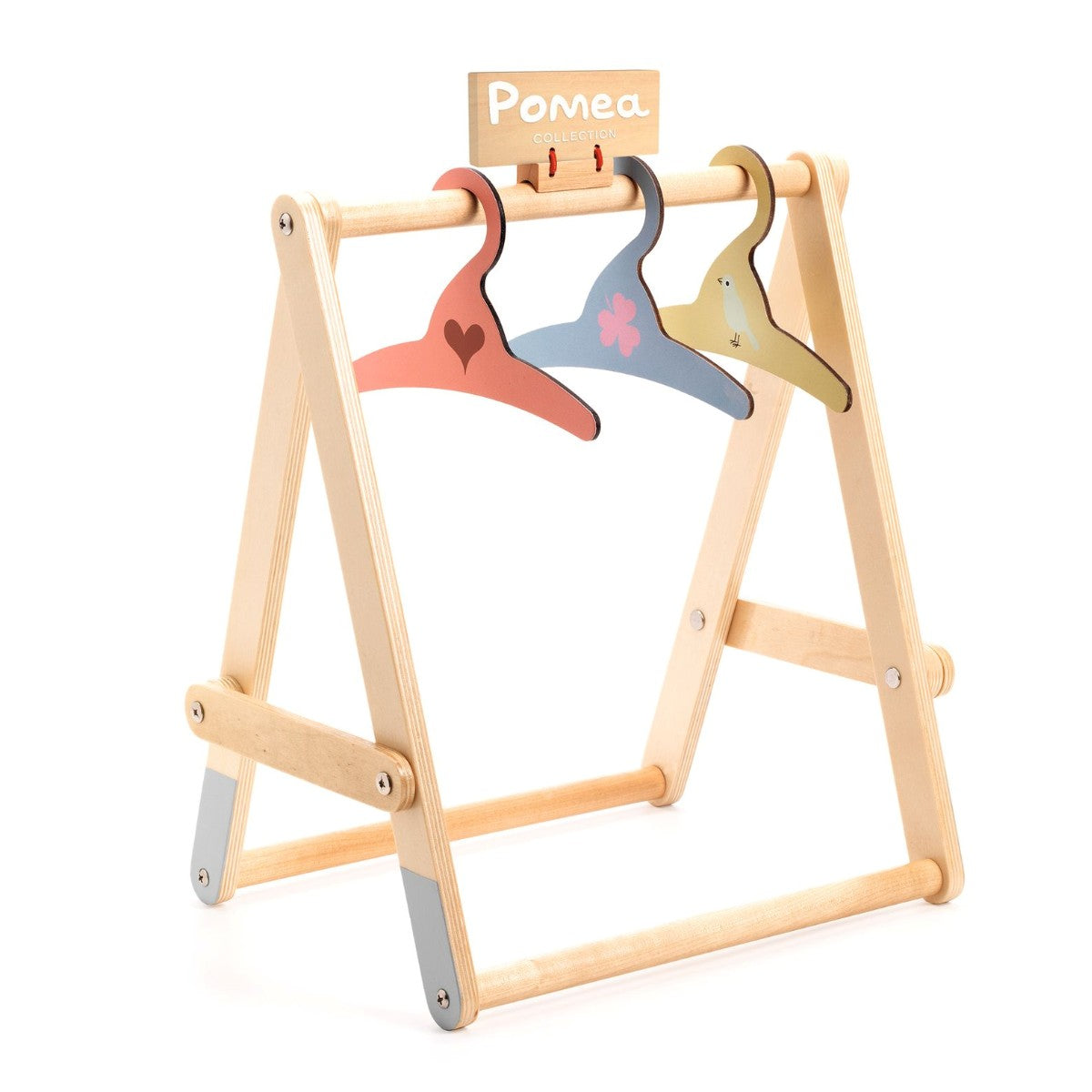 Det flotte garderobestativ i træ er ikke bare flot at have stående, det er også praktisk, så du nemt kan overskue dit Pomea dukketøj, og hurtigt vælge dagens outfit. Der medfølger 3 bøjler.