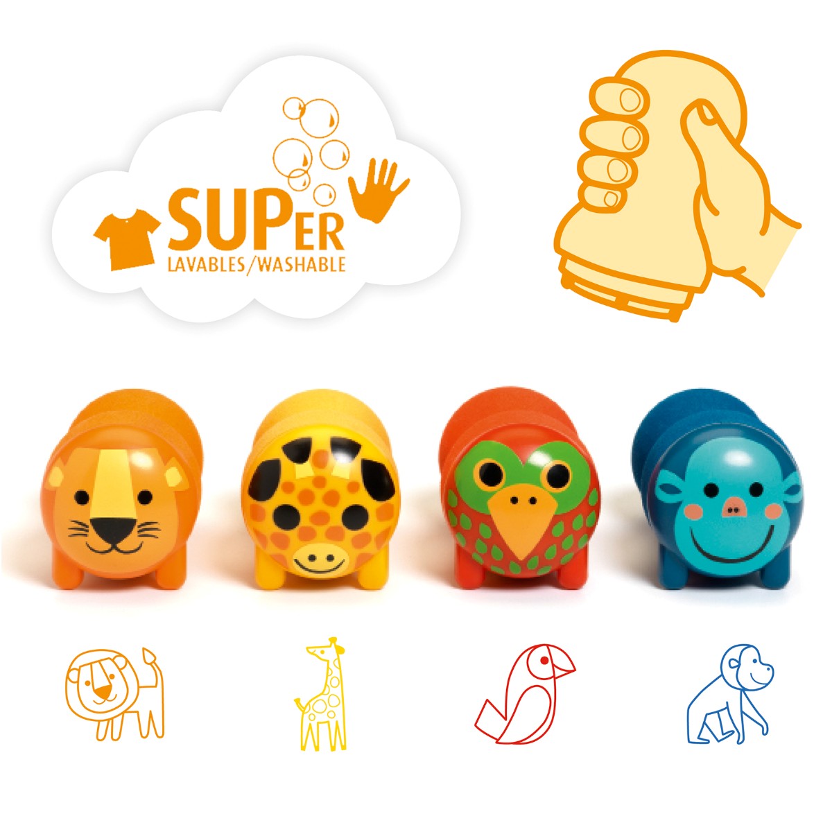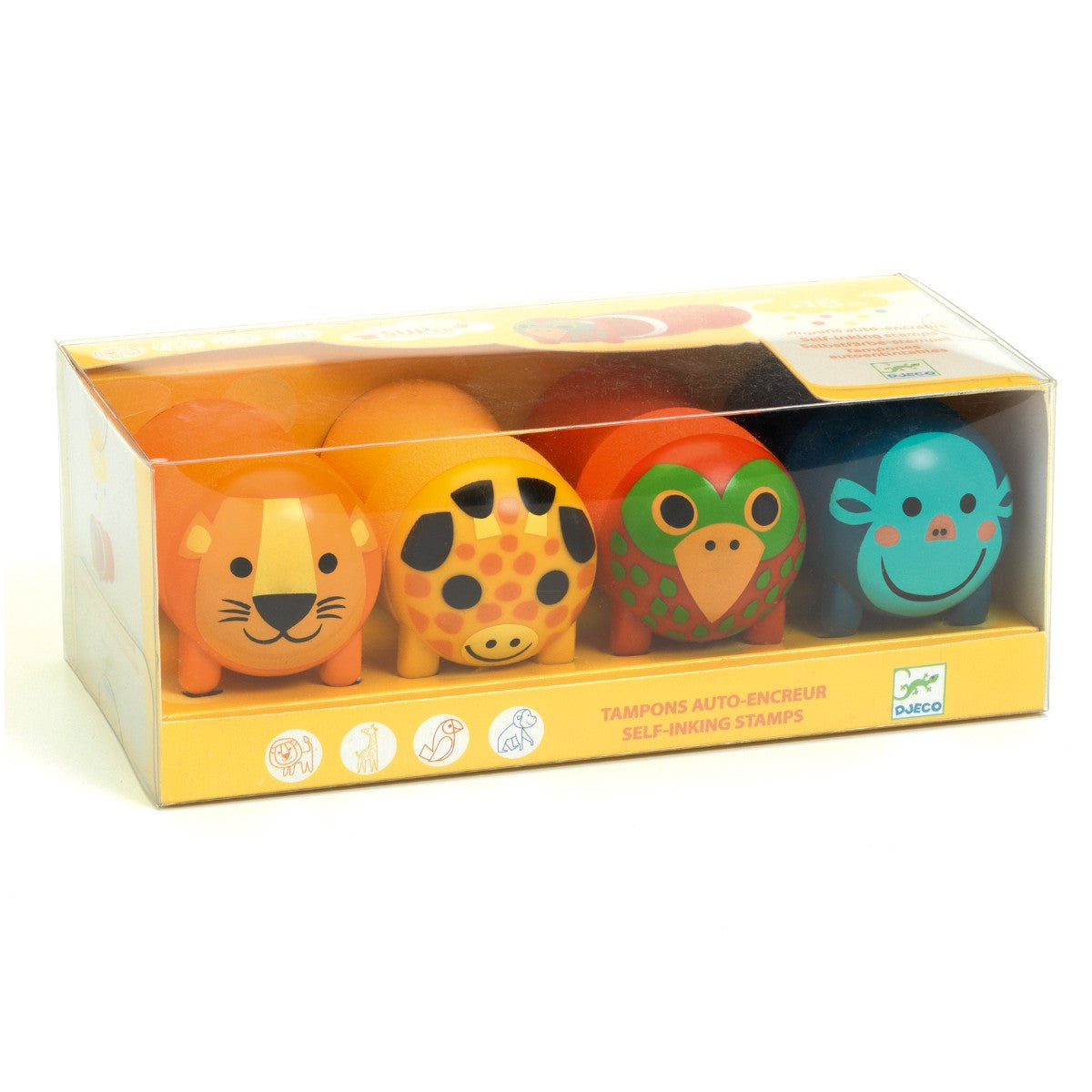 Sjove stempler med vilde safari fra Djeco. Farven er indbygget i stemplet, de er supernmemme at holde om, og så er de helt ned fra 1,5 år.
