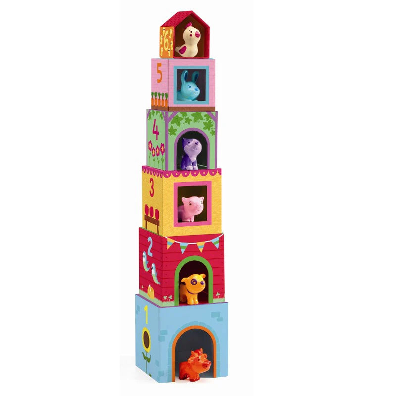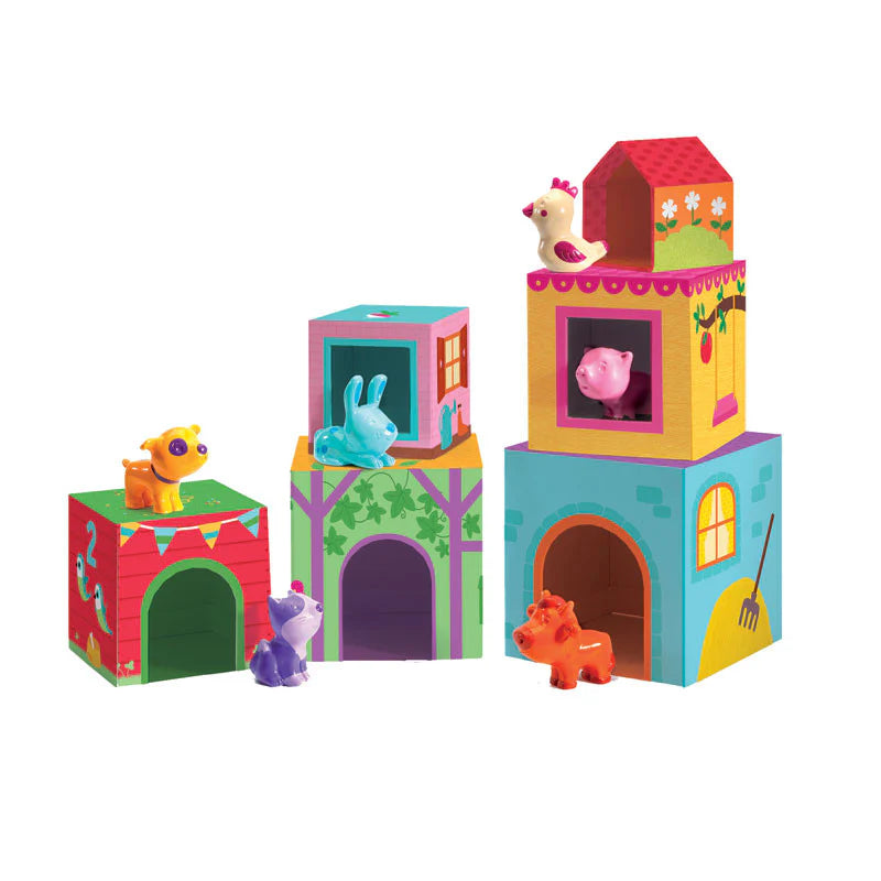 De klassiske originale stableklodser hvor der medfølger 6 søde dyr i plast. Klodserne er alle omdannet til små """hundehuse""", så hvert dyr kan bo i sin egen klods.