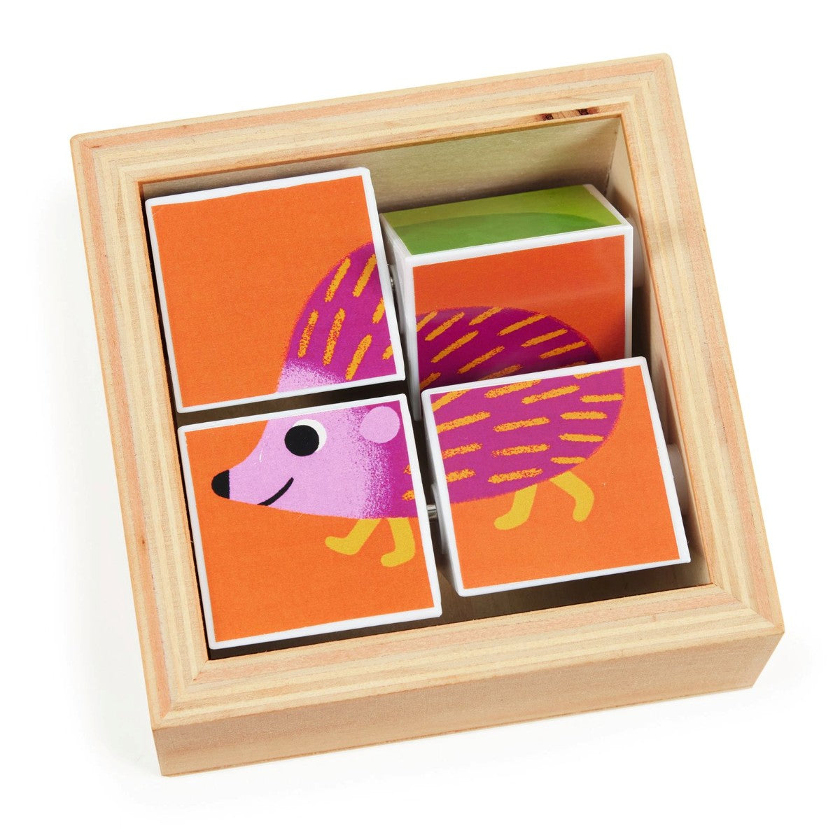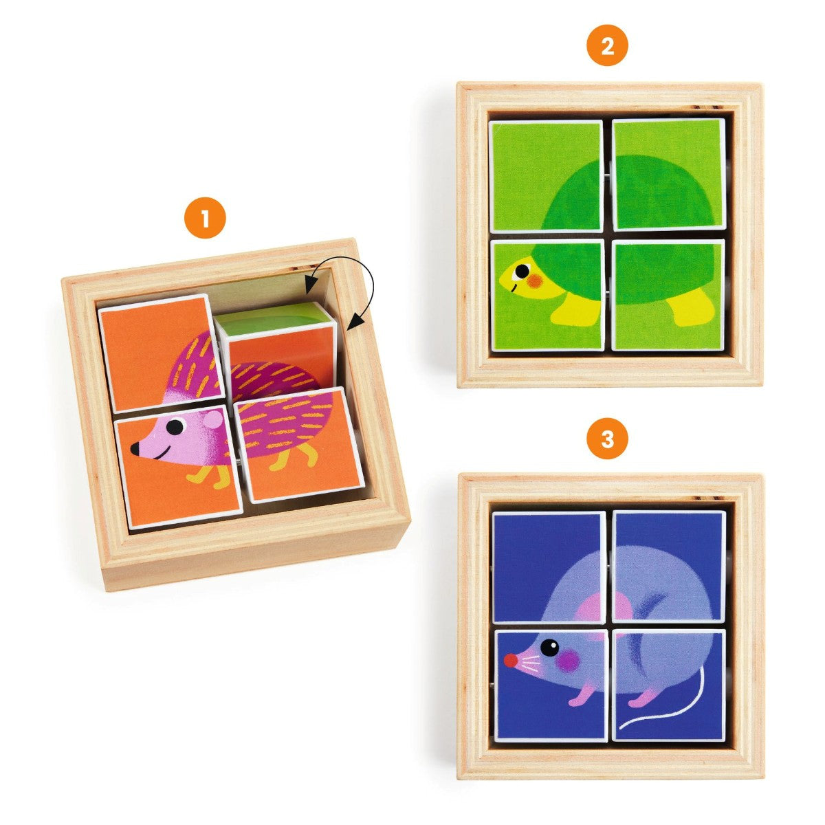 Den lille trækasse indeholder 4 fastsiddende, bevægelige klodser, så du kan skabe 3 forskellige dyr (pindsvin, skildpadde og mus).