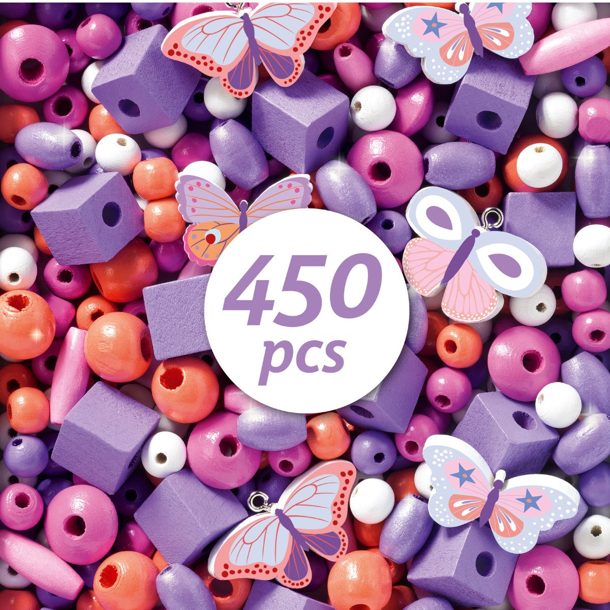 En æske fuld af smukke træperler fra Djeco med temaet sommerfulgle, til det kreative barn. Træk perlerne på den medfølgende snor og lav dine egne smykker.