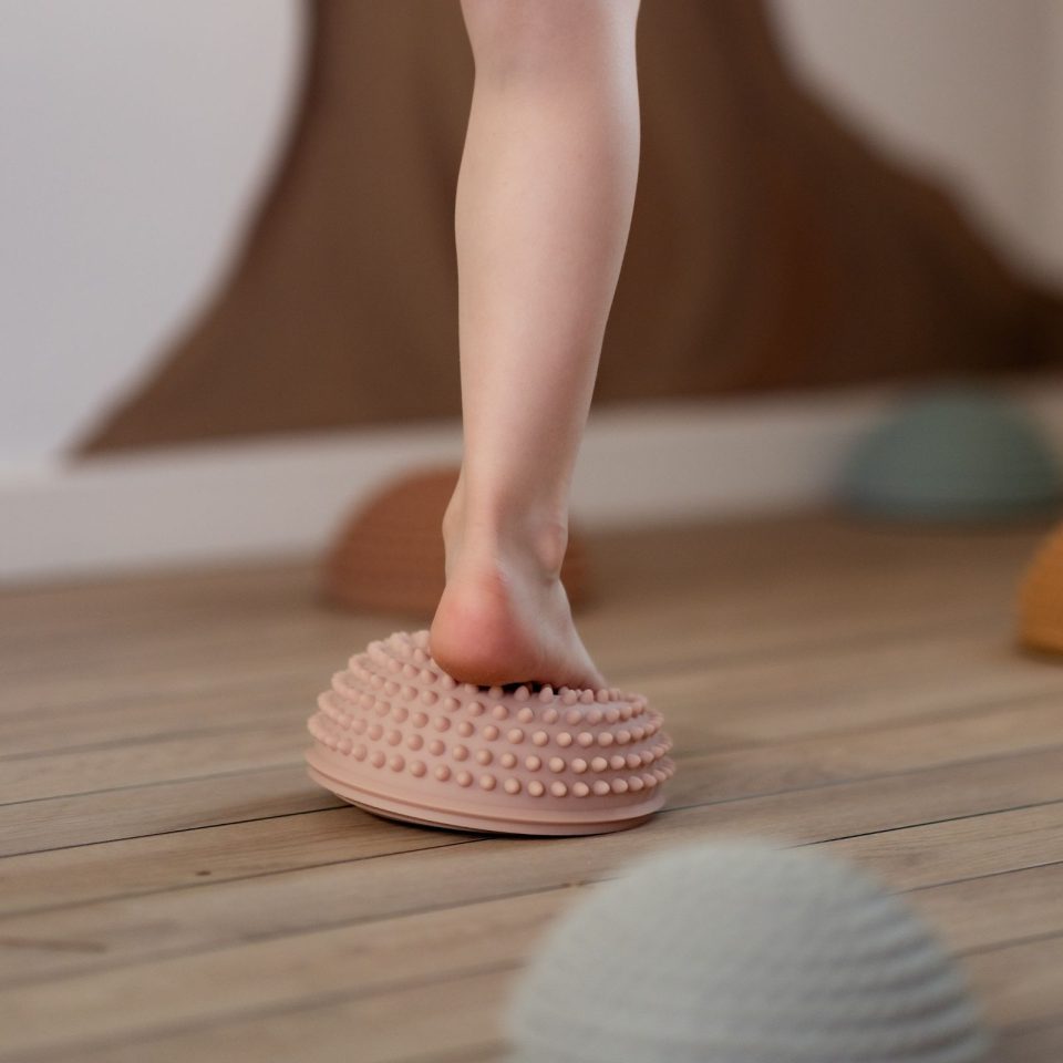 Sæt med fire sansesten til at træne balance og bevægelse. De er flade i bunden og runde i toppen. De har alle fire små knopper på, som gør det lettere for barnet at stå fast, samtidig med at de stimulerer taktilsansen. De kan bruges på flade overflader, hvor de kan ligge stabilt – både ude og inde. De kommer oppustede, så de er klar til brug, og de kommer i et sæt med fire stykker. Alle er matte i finishen og holdt i nordisk inspirerede farver, hentet fra naturen. Her er de i en variant kaldet 'solopgang' med farverne "Metallic Blue", "Persian Orange", "Heavenly Garden" og "French Gray". De kan tages i brug, når barnet er to år gammelt, og de tåler en vægt på op til 50 kilo.