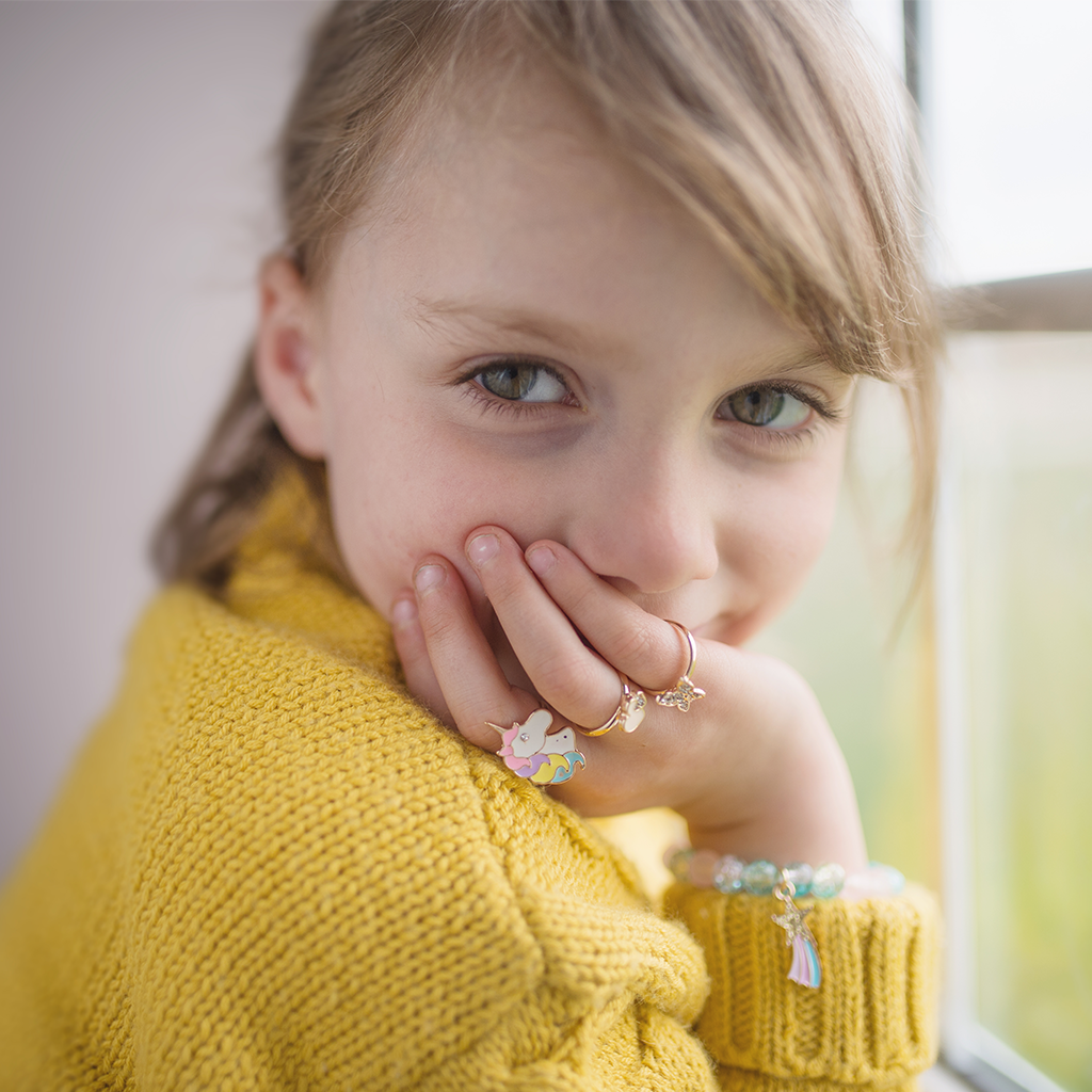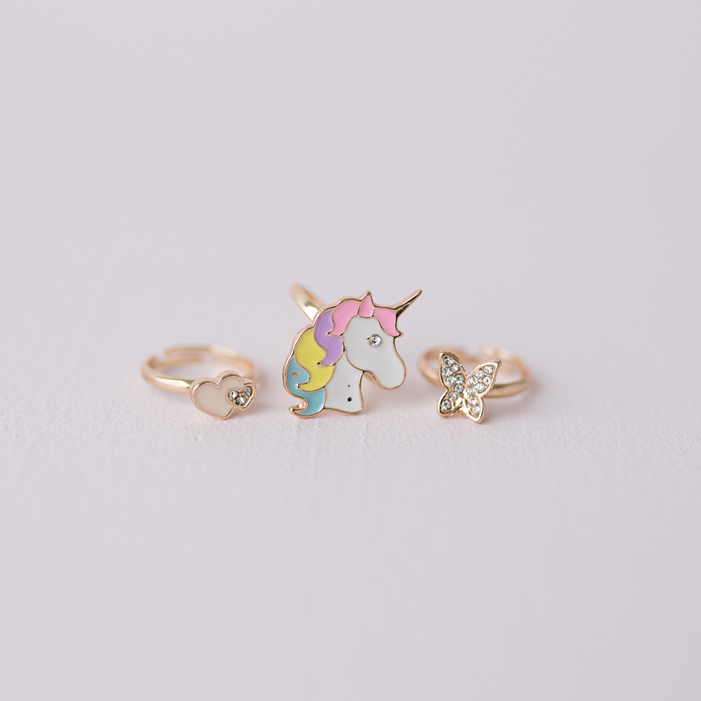 Et fint sommerfugl & enhjørninge ringsæt med 3 i. De er designet til at passe barnets fingre med størrelsesjusterbare funktioner. Dette smukke sæt er lavet med rosaguldsmetaller.