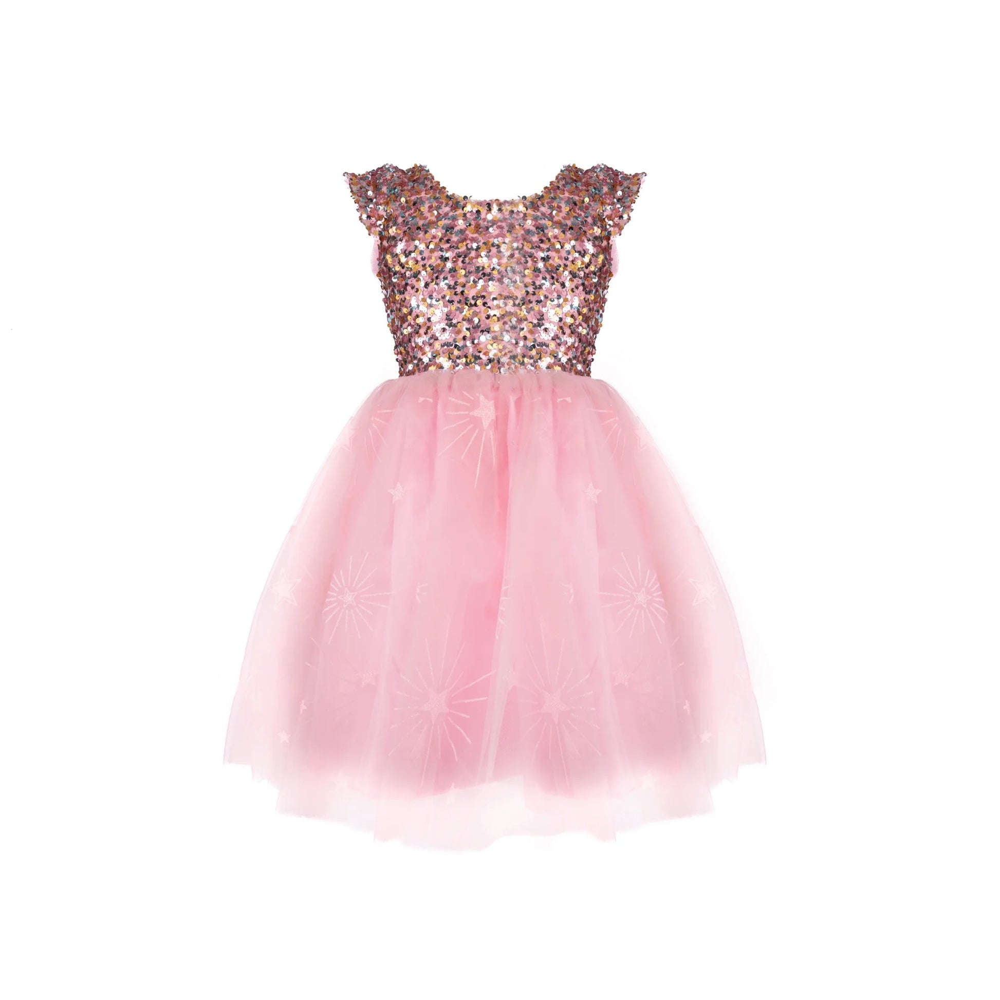 Fra den glitrende top flyder et drømmende pink tylskørt, pyntet med glinsende stjerner, der giver et fantasifuldt og eventyrligt touch.
