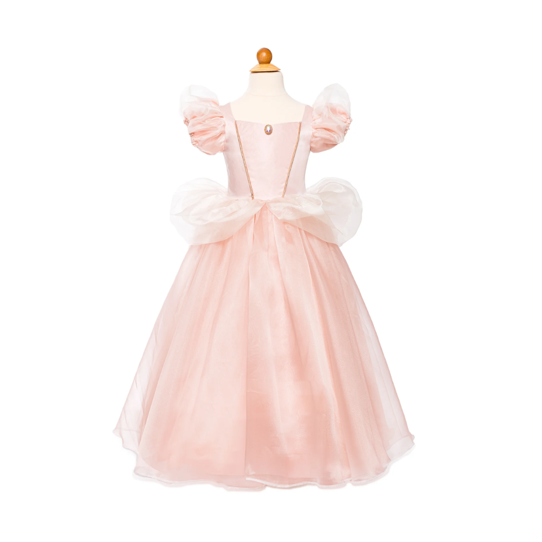 Kjolen er draperet i en blød og glitrende lys pink taft, med puffede ærmer der tilføjer et strejf af royal charme og giver den helt rigtige mængde sofistikering til en lille prinsesse.