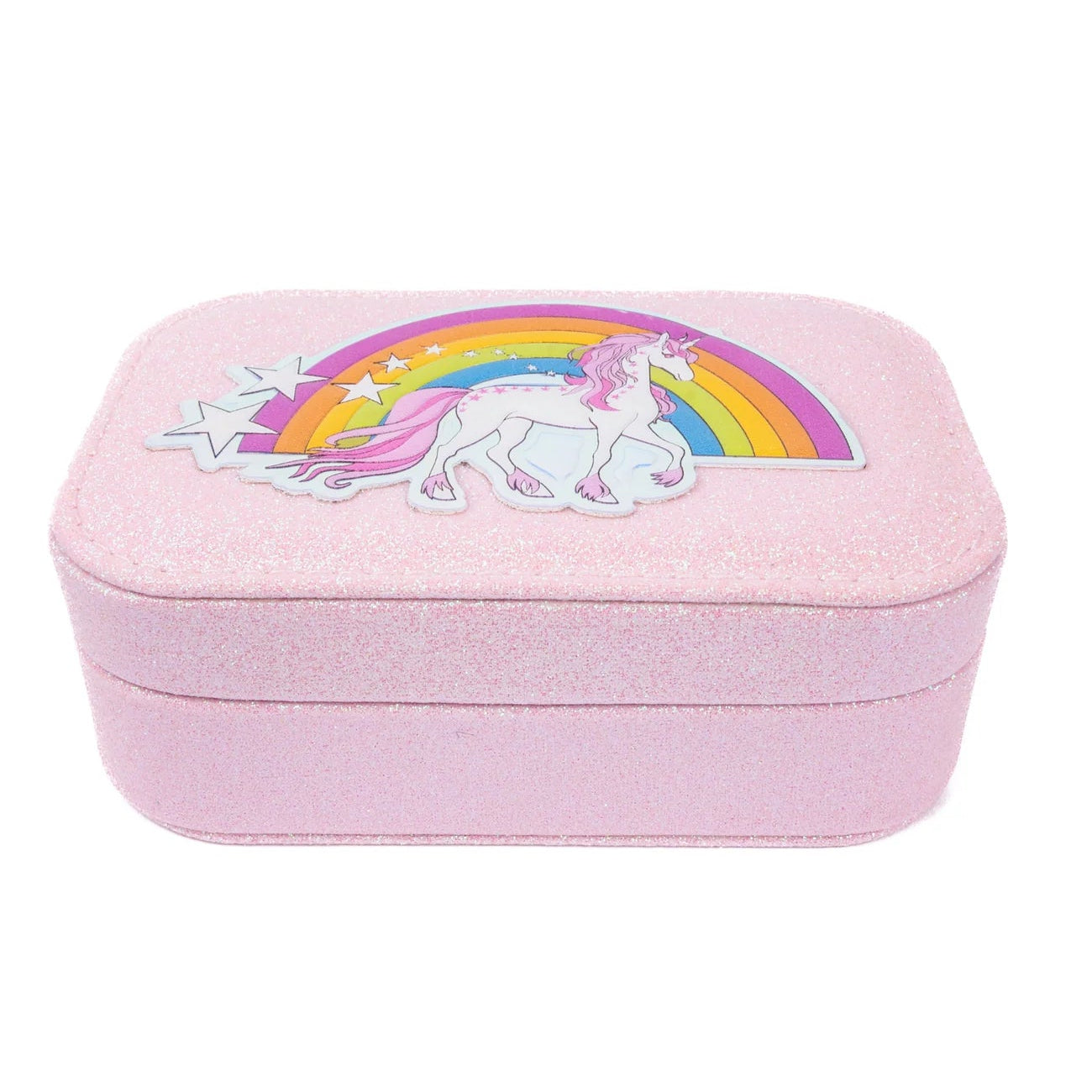 Hold dine smykker sikre med magisk stil. Smykkeskrinet er dækket af glitrende pink glimmer og pyntet med et fantasifuldt design med enhjørning og regnbue.