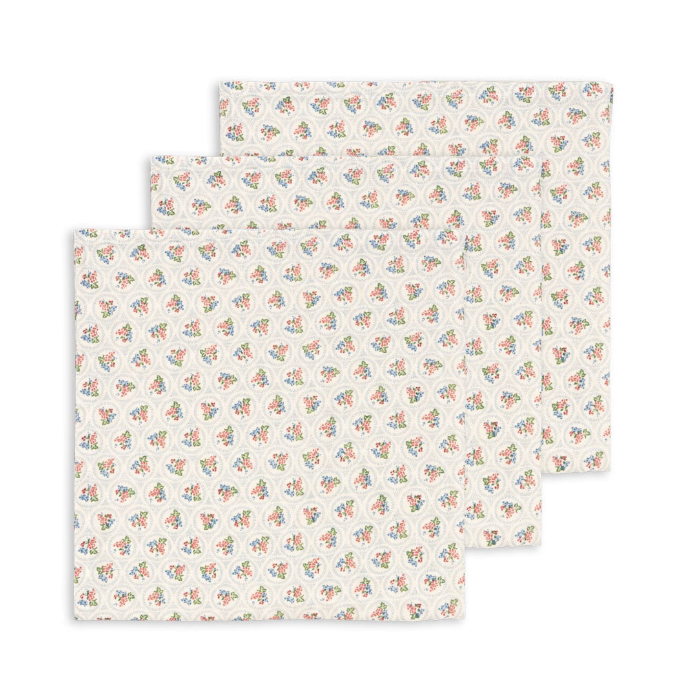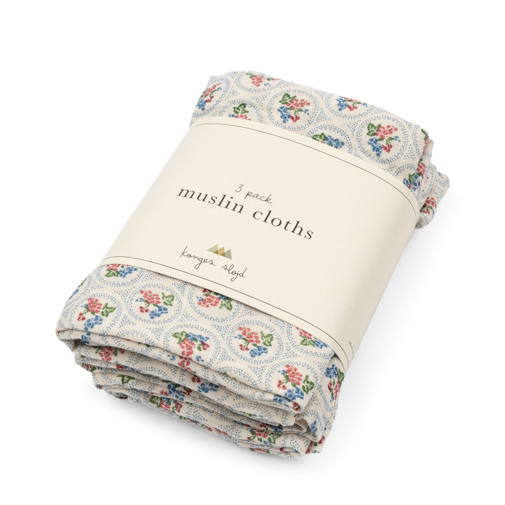 Konges Sløjds pakke med 3 stk. stofbleer fremstilles i det blødeste 100% økologiske bomuld, har det fineste print. Stofbleerne kan tåle at blive vasket på 40 grader, og bliver kun blødere for hver vask. Konges Sløjd har syet en lille sød detalje af deres logo, som kan fungere som en lille snor, der kan hænges op. Denne detalje er placeret i stofbleens ene ende.