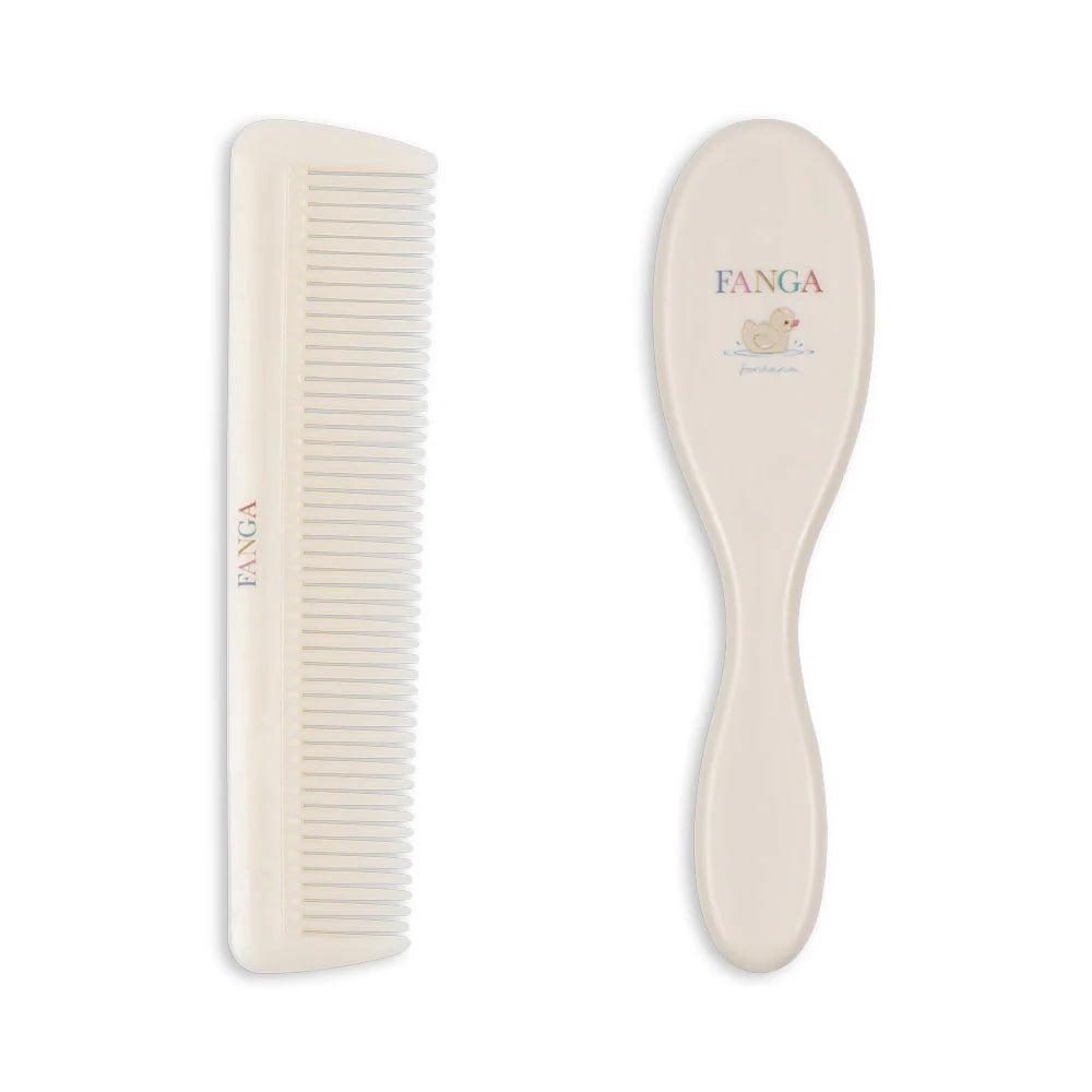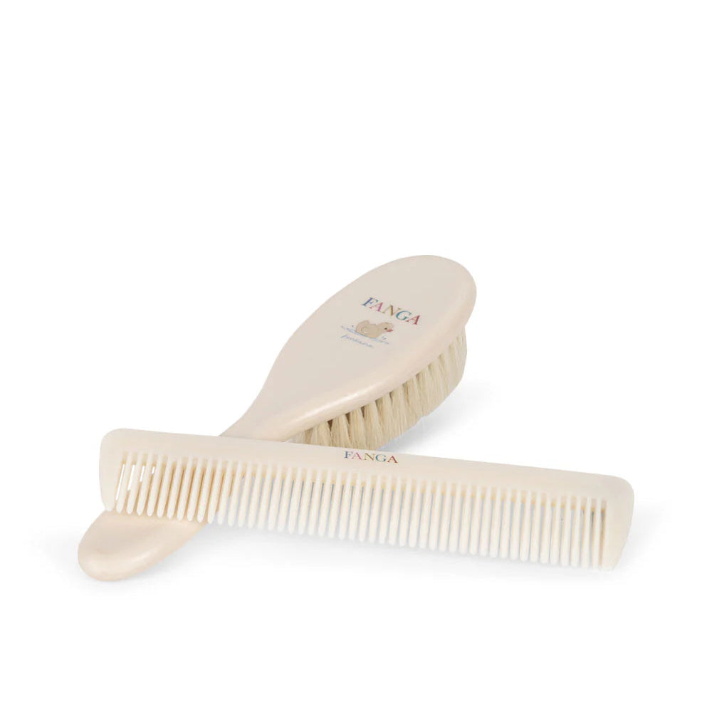 Sødt lille sæt til din babys første hårbørstning. Sættet indeholder en kam og en børste med de blødeste uldhår, som er skånsomme mod babys sarte hud. Brug børsten og kammen til en afslappende, daglig hovedbundsmassage, som også hjælper med at forebygge arp.