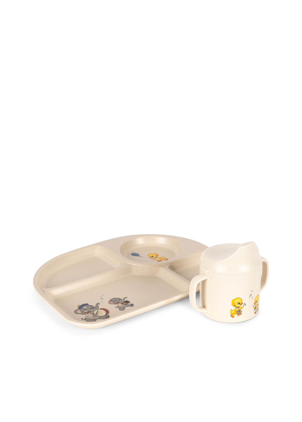 Der er en første gang for alting, så hvorfor ikke gøre det sødt og sjovt? Dette spisesæt er designet specielt til babyer, der lige er begyndt at spise fast føde. Sættet indeholder en lækagesikker tudekop og en praktisk tallerken, hvor du kan inddele maden i rum, så den bliver lettere for dit barn at udforske. Perfekt til f.eks. dåbsgave eller fødselsdagsgave.