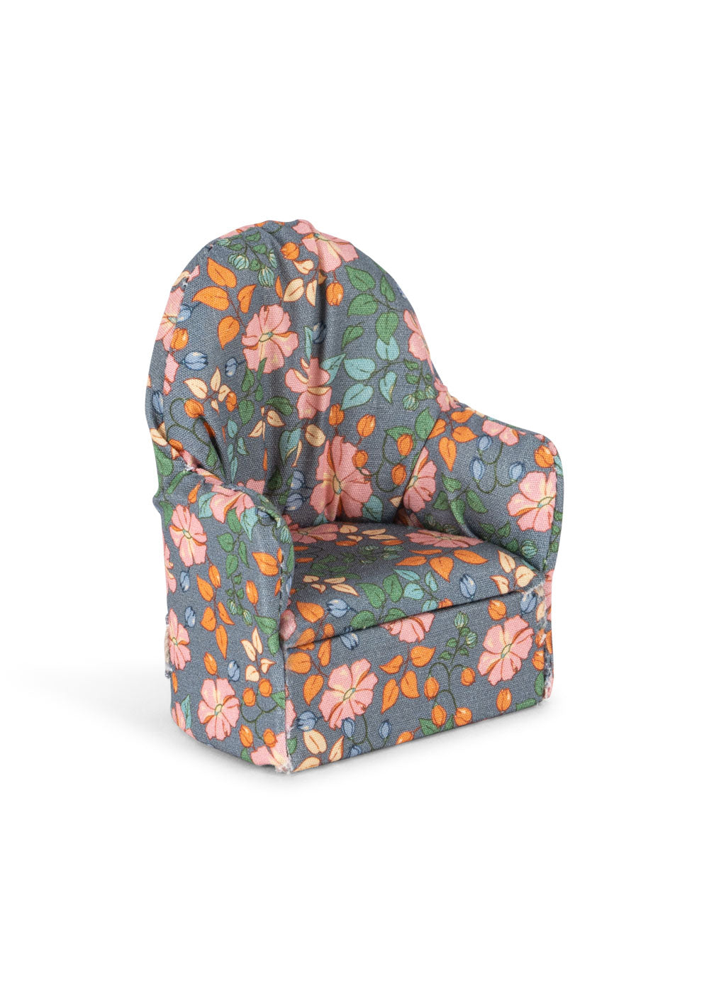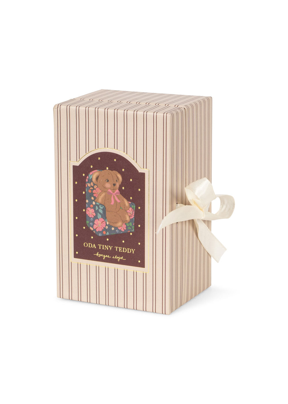 Sød lille miniaturebamse. Oda leveres i en lille fin opbevaringsæske, og der medfølger endda en vintageinspireret lænestol.