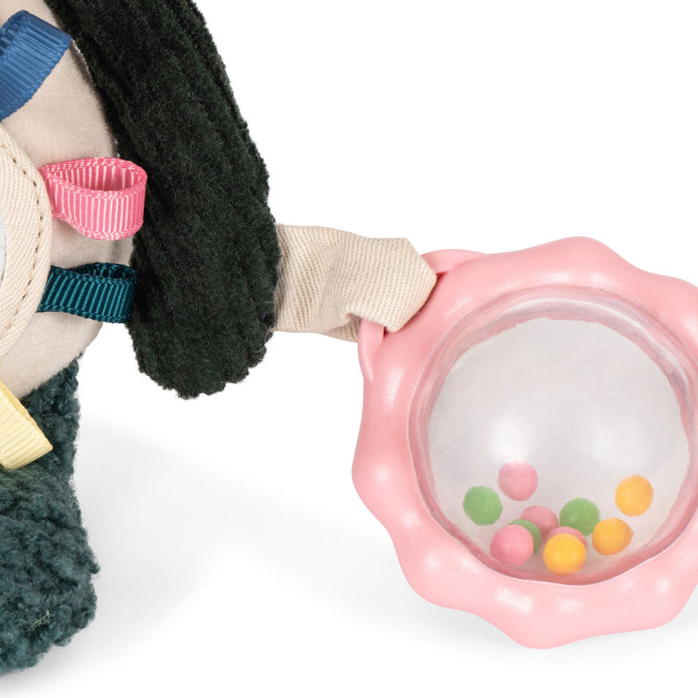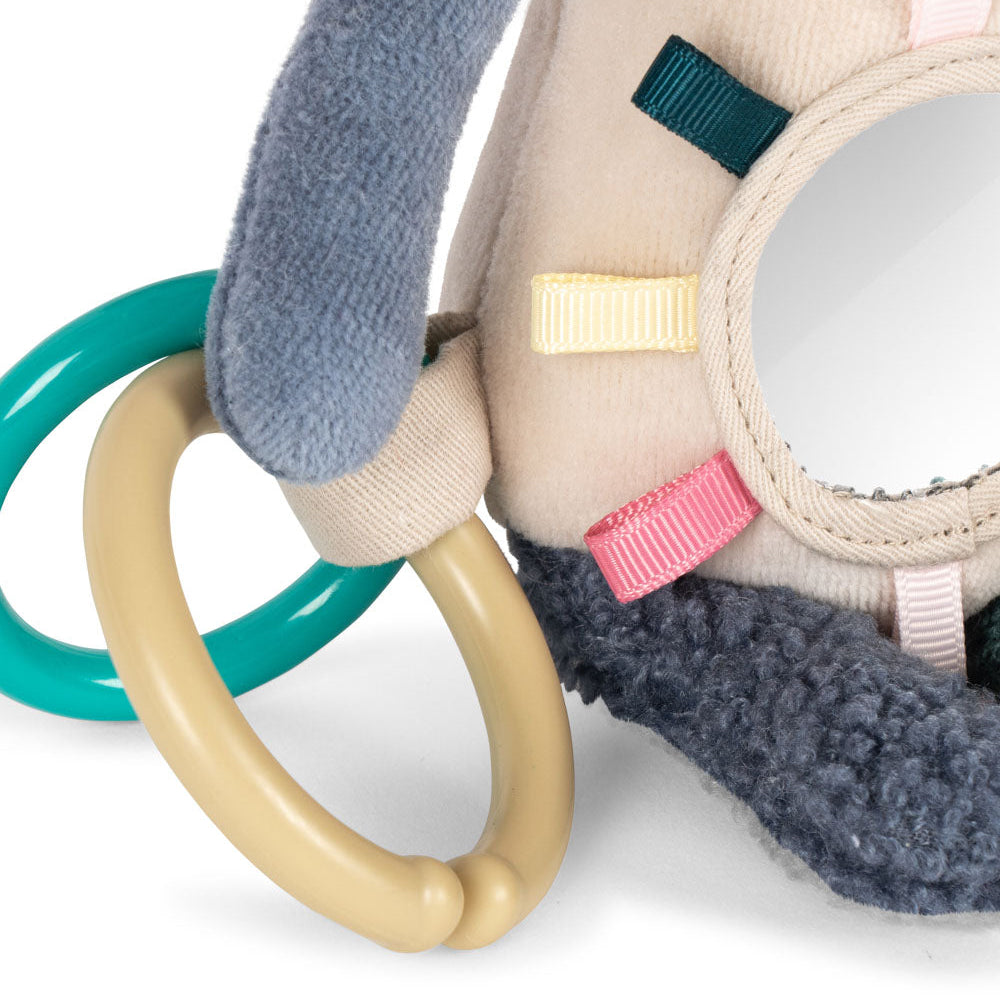 Det bløde sanselegetøj er nemt at gribe fat i for søde små hænder. Peluche har forskellige teksturer, der stimulerer sanserne, en ranglefunktion, et spejl og håndtag, der er nemme at gribe fat i.