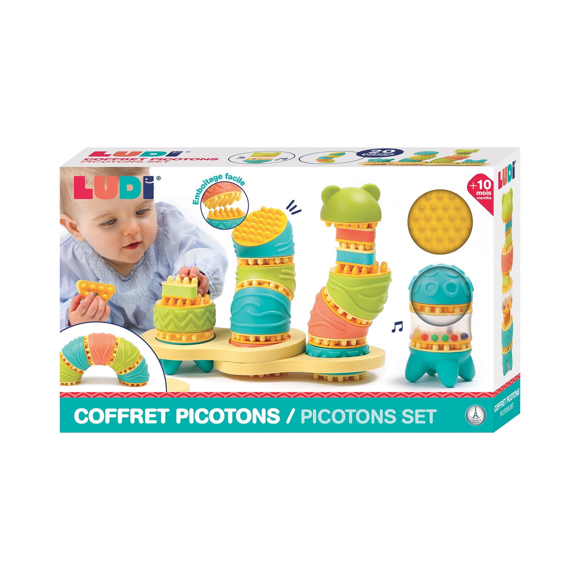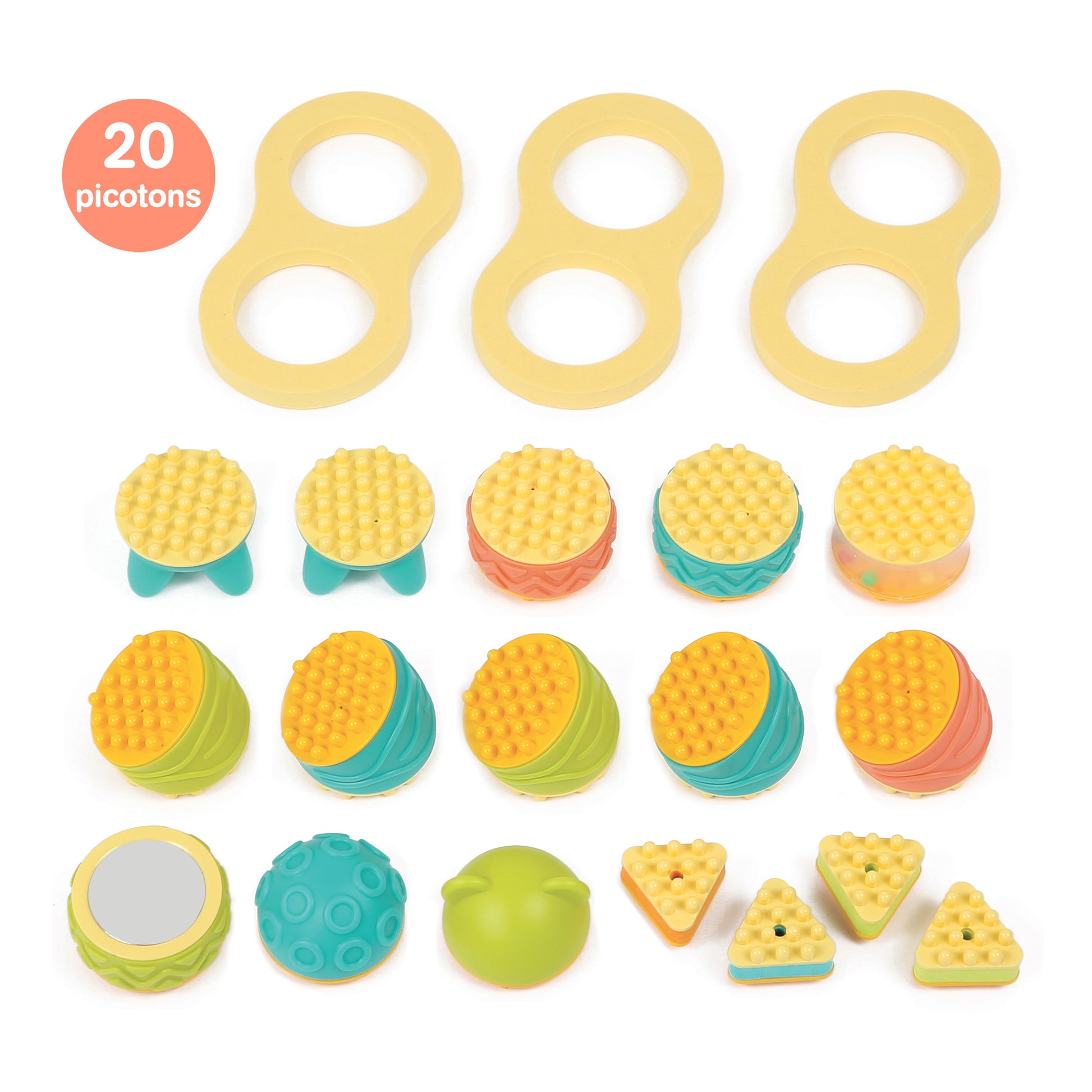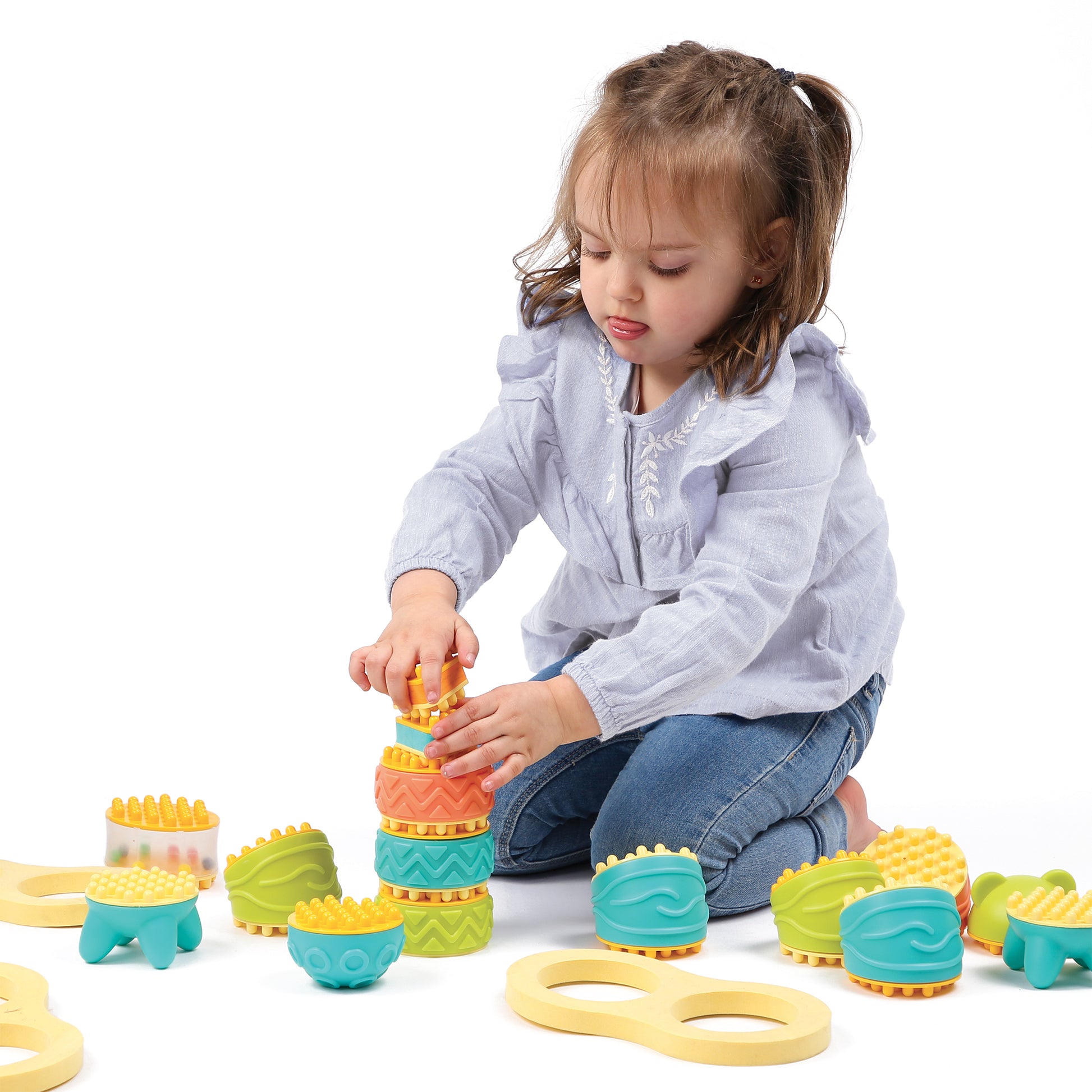 Sættets bløde tekstur, lyse farver og geometriske former stimulerer barnets interesse til leg og læring.
