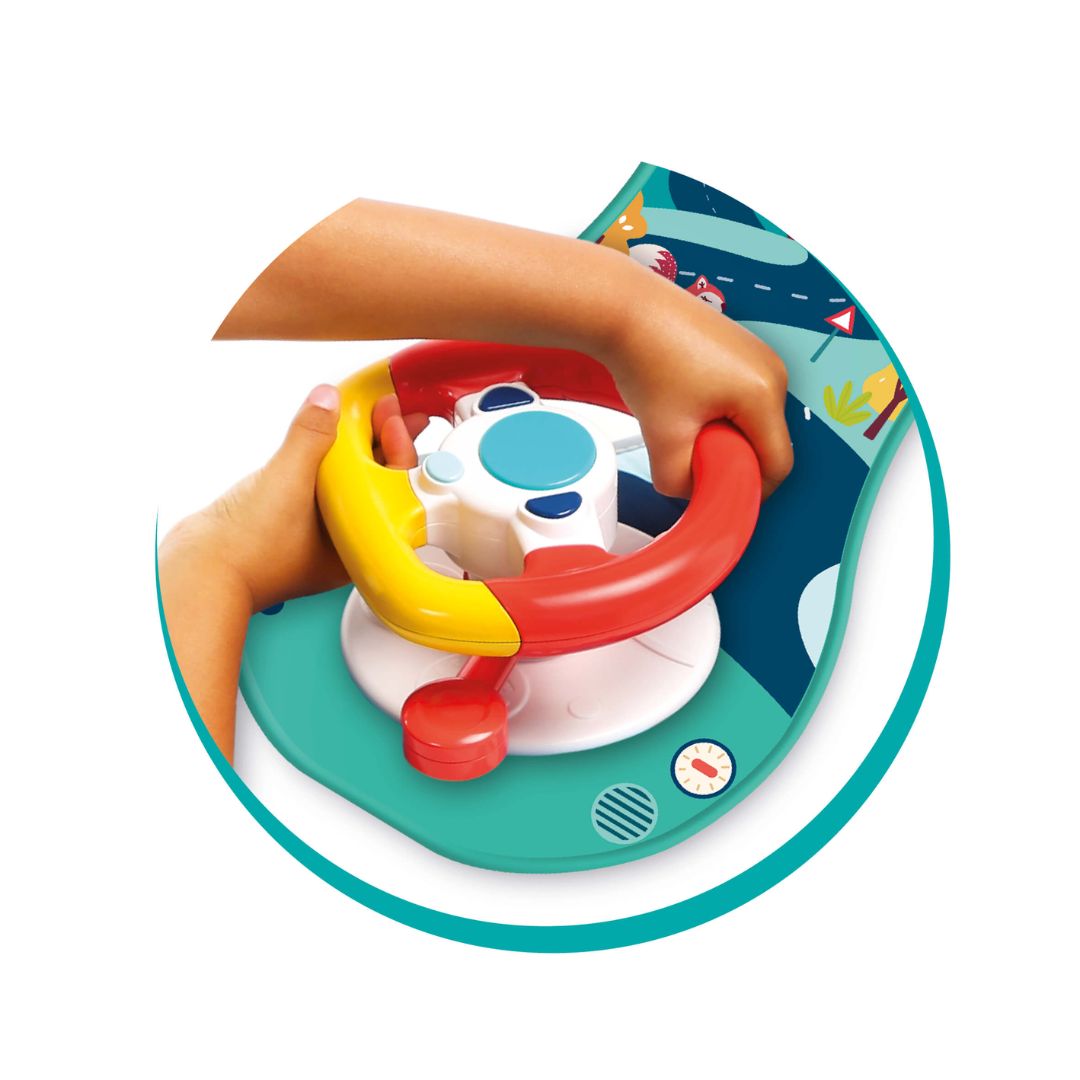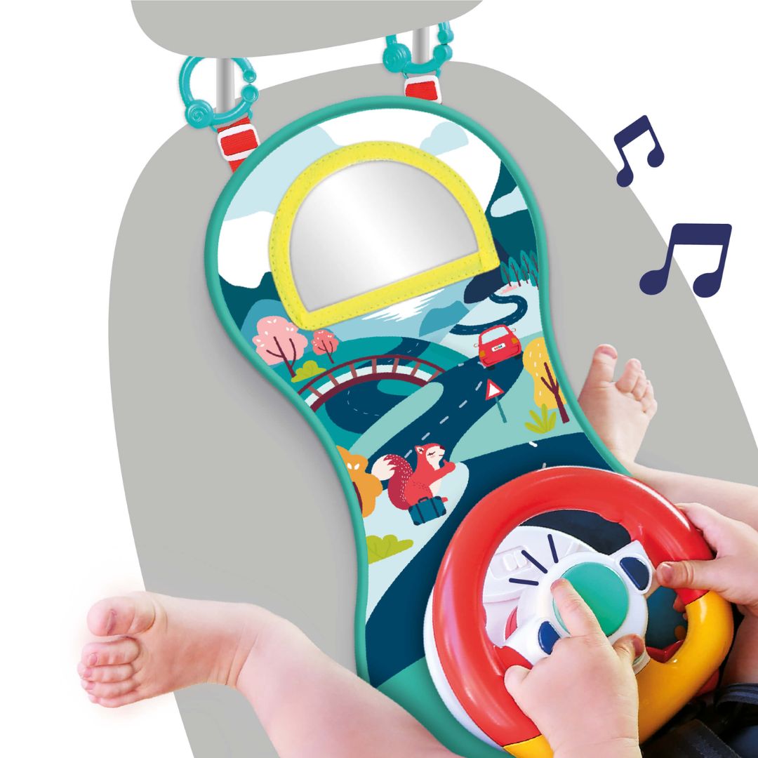 Stort aktivitetspanel til at holde barnet beskæftiget under lange ture. Barnet vil have det sjovt med at foregive at køre som de voksne. Legerattet har startlyde, horn, blinkende lys og spejl. Panellet har justerbare stropper og 2 fastgørelsesringe. Nem at have med og kan hænges hvor som helst f.eks. bilen, sengen, klapvognen osv.