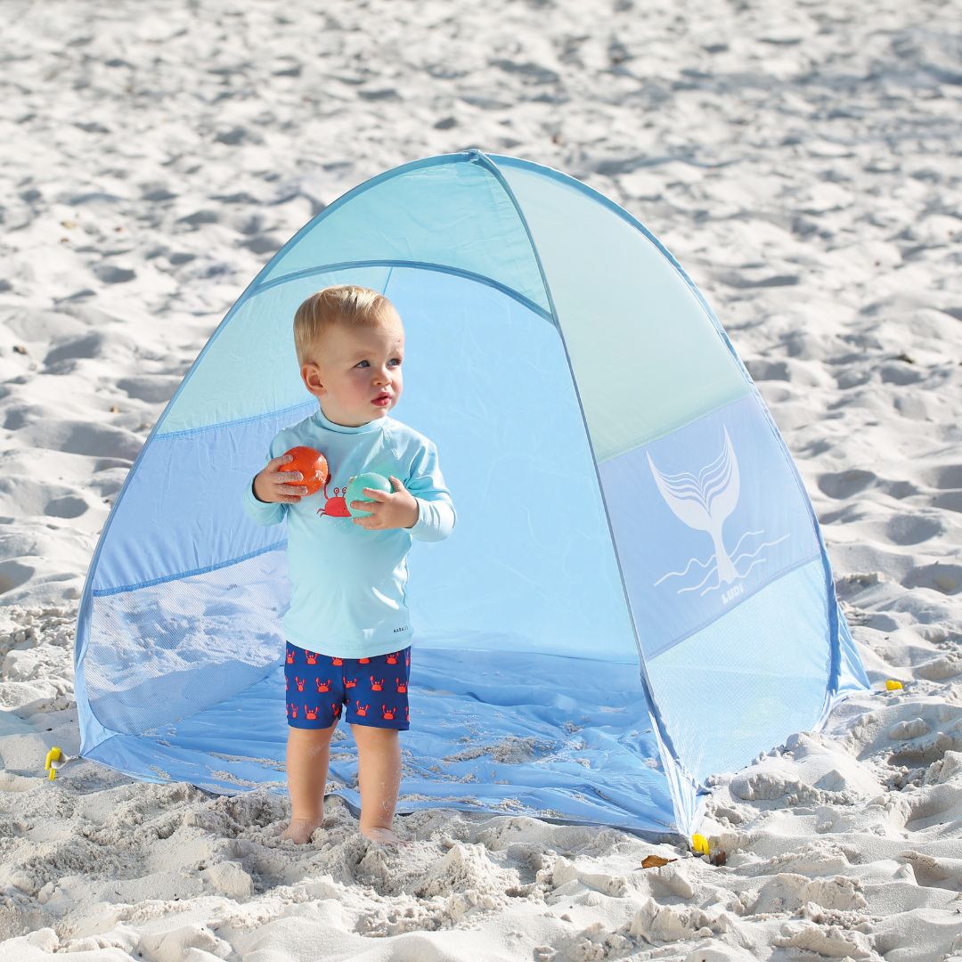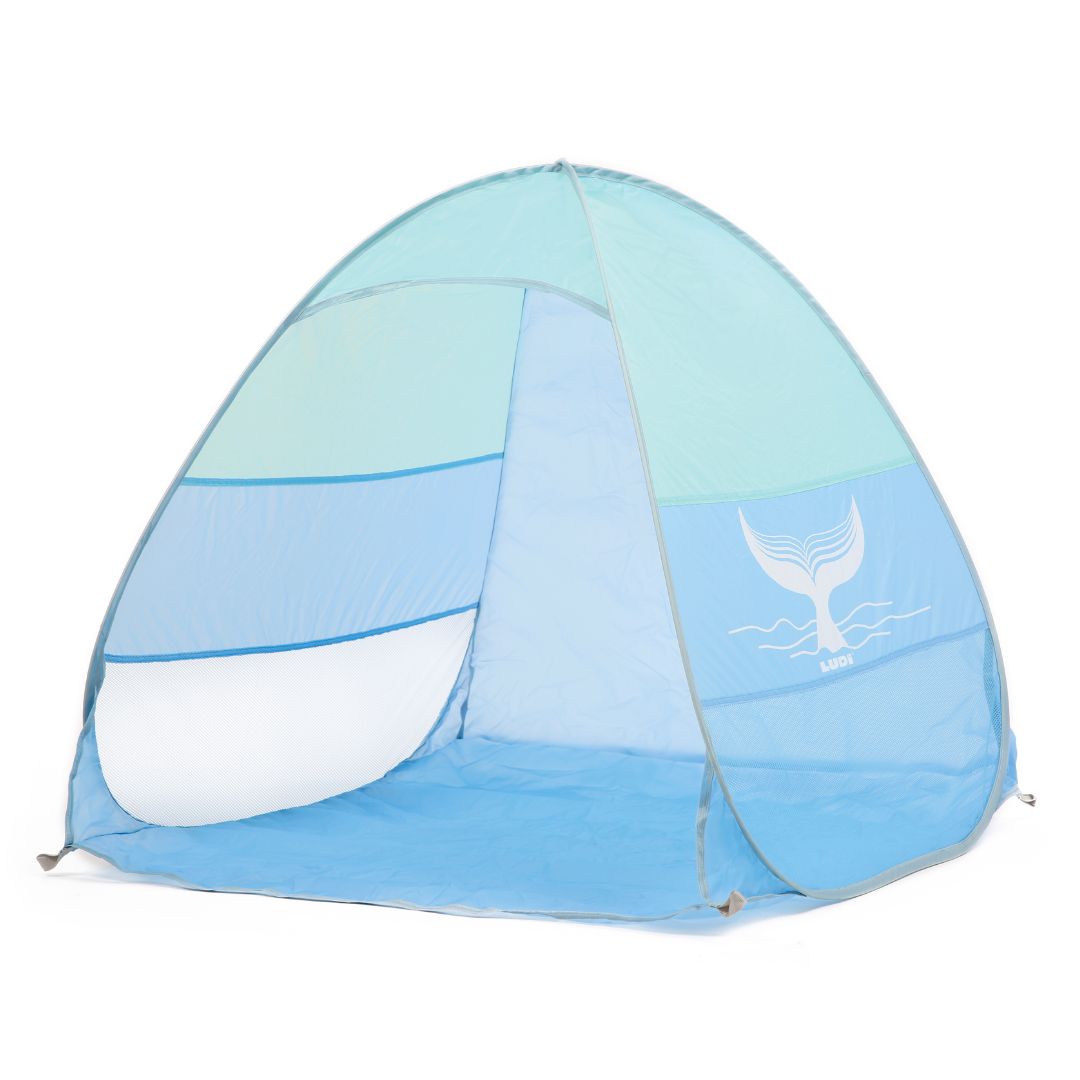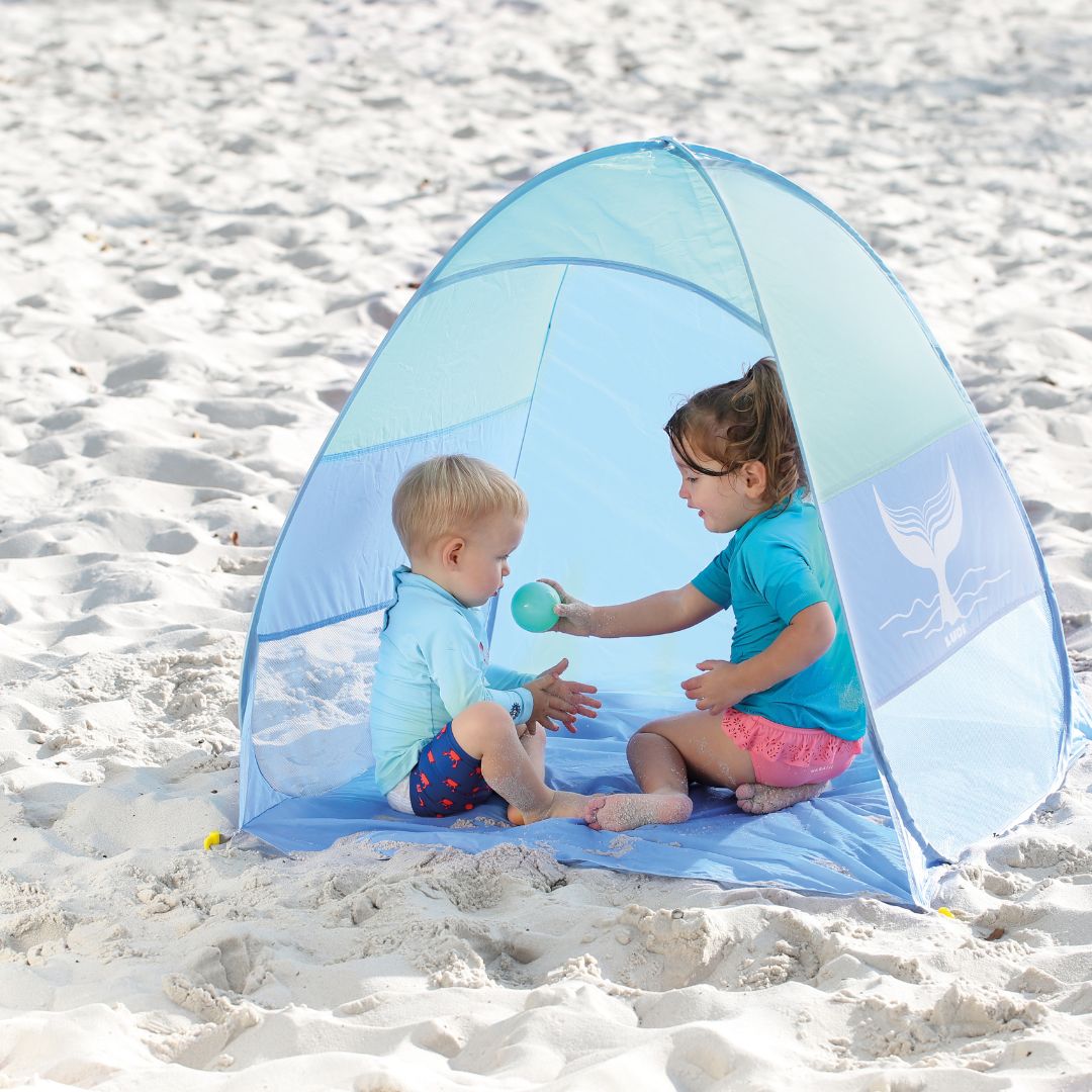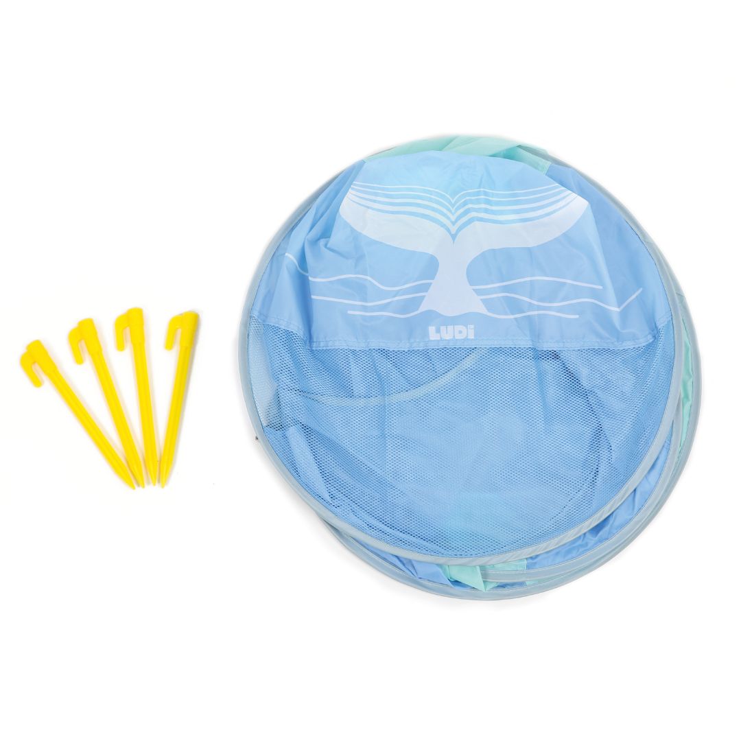 Dette smart pop-up telt er perfekt til at have med på stranden eller i haven. Teltet giver læ og beskytter med solens stråler. Her er der plads til mange timers leg. Teltet kommer i en bæretaske og der medfølger 4 pløkker, hvis det nu skulle blæse lidt.