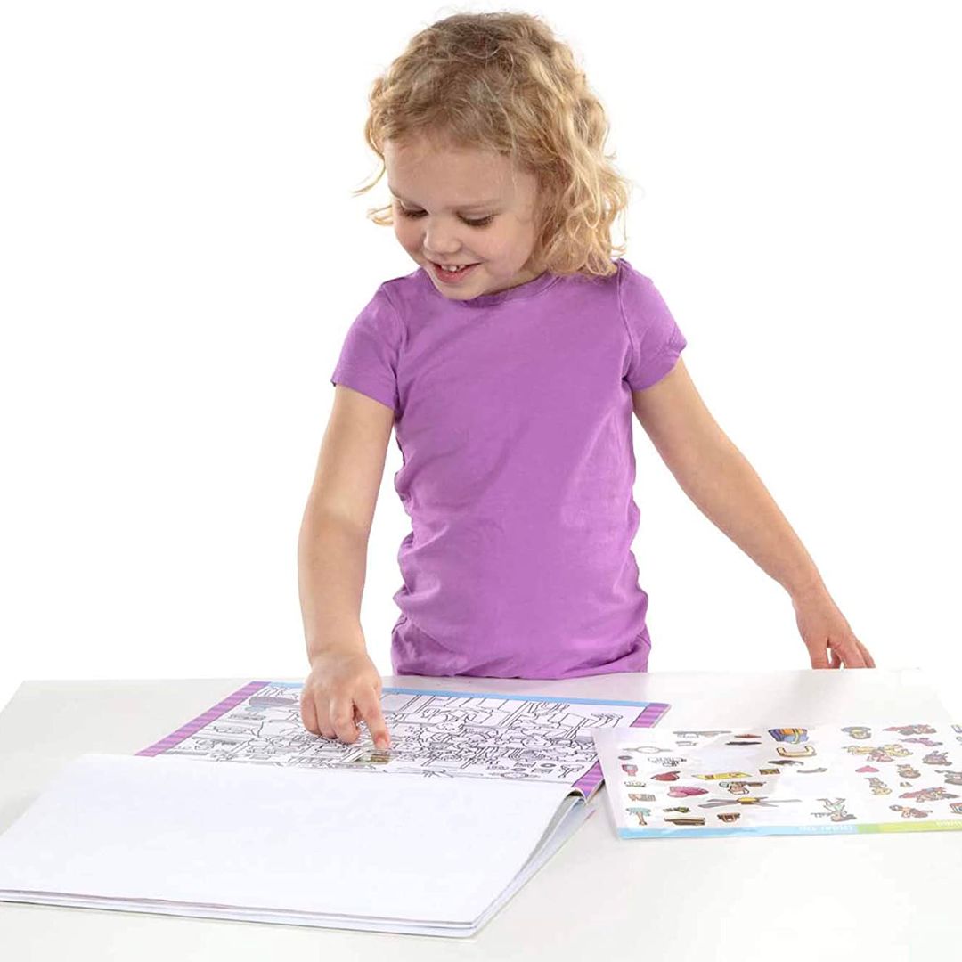 Tag med rundt omkring i byen og find alle figurerne på klistermærkearkene. Når du har fundet et match, kan du sætte klistermærket på! Kombiner farvelægning med klistermærkesjov på de 14 forskellige scener. Der er mere end 400 klistermærker, så der er til mange timers leg!