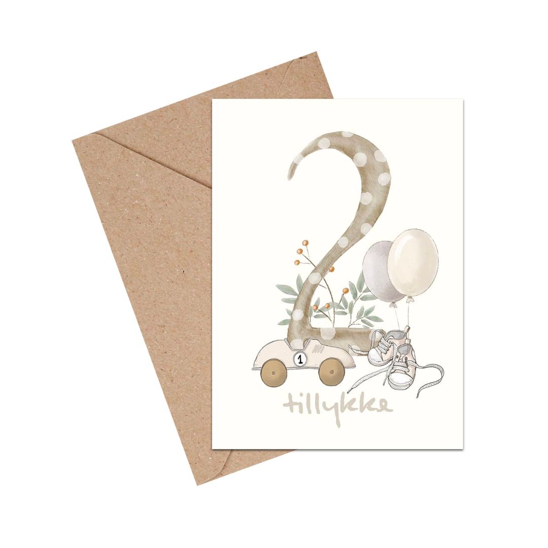2 ÅRS FØDSELSDAGSKORT MED SMÅ SKO OG VINTAGE BIL