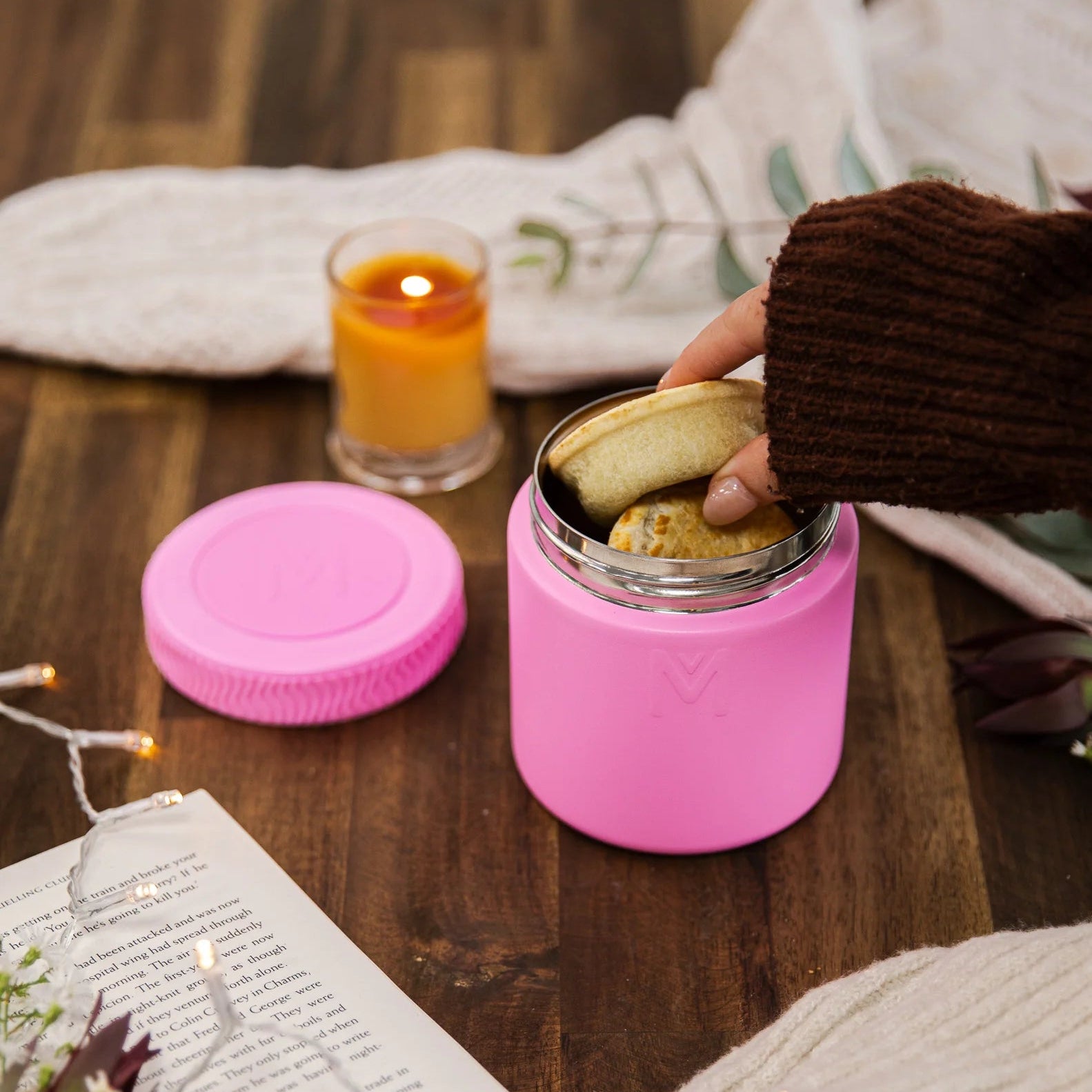 BPA-frit polypropylenlåg med grebsvenligt silikonebånd for nem åbning.