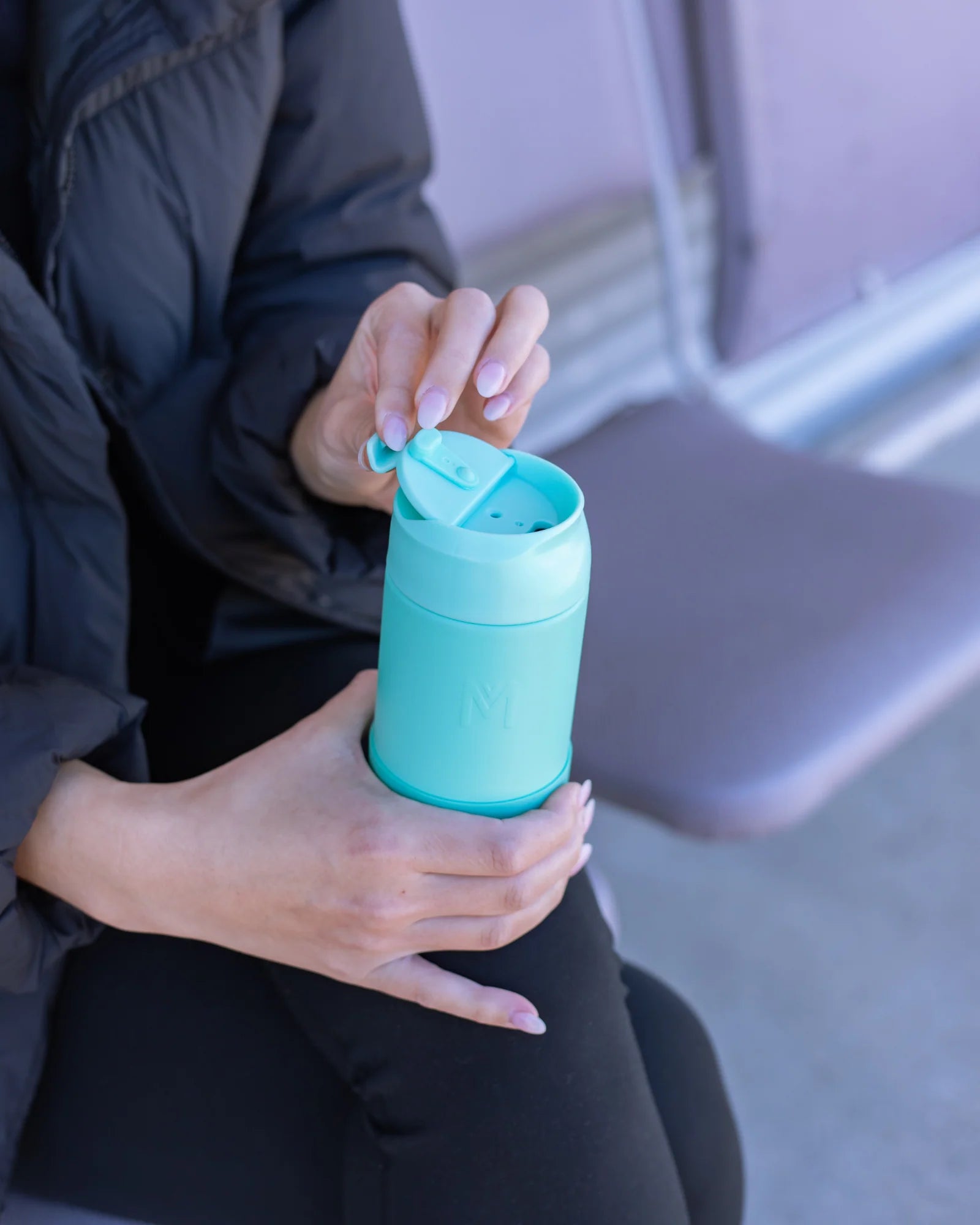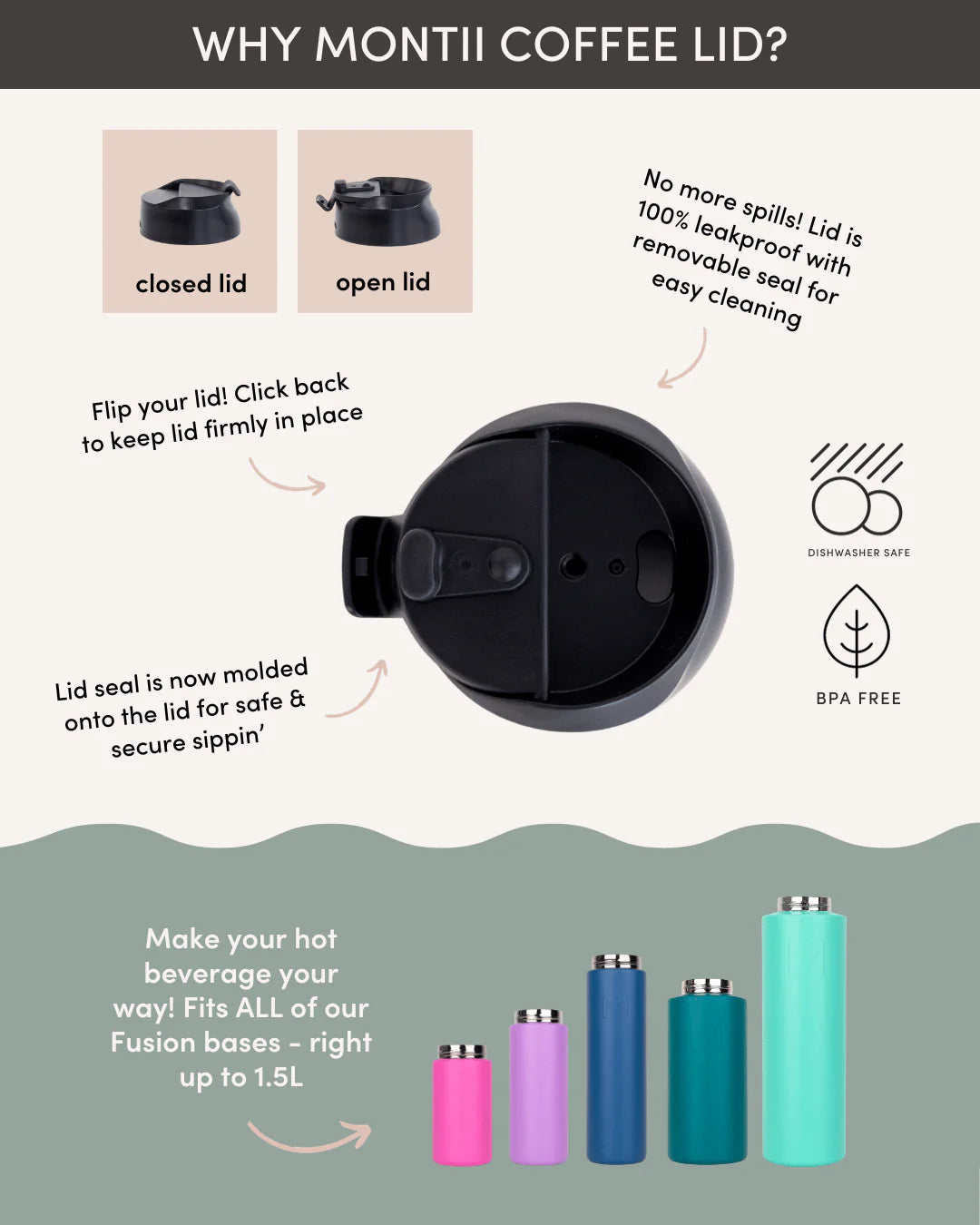 Det universelle låg kan sammensættes med alle Montii's drikkedunke. På den måde kan du sammensætte din helt egen unikke drikkedunk. De nye kaffelåg er lette at drikke af,l og holder tæt, når det lukkes korrekt.