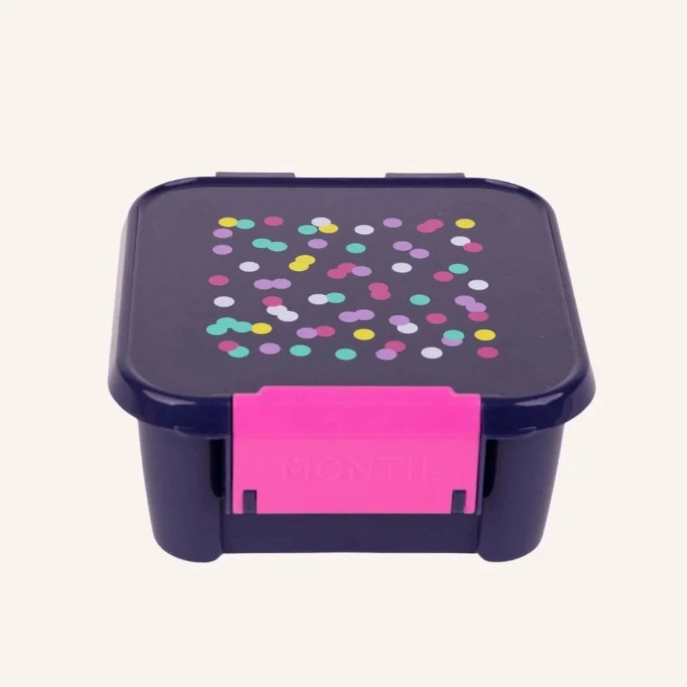 Montii har lavet denne snack box, Bento Two, med to forseglede rum og en lille skillevæg, så det er nemt at opdele barnets snacks. Vær opmærksom på, at skillevæggen ikke er tæt ved flydende væsker, men blot opdeler maden. Forseglingen betyder, at maden holder sig frisk i længere tid. Dvs. du kan skære frugt ud, og det vil stadig være friskt, når barnet skal have eftermiddagssnacks. Bento two har en børnevenlig åbning, så barnet nemt kan åbne sin madpakke.