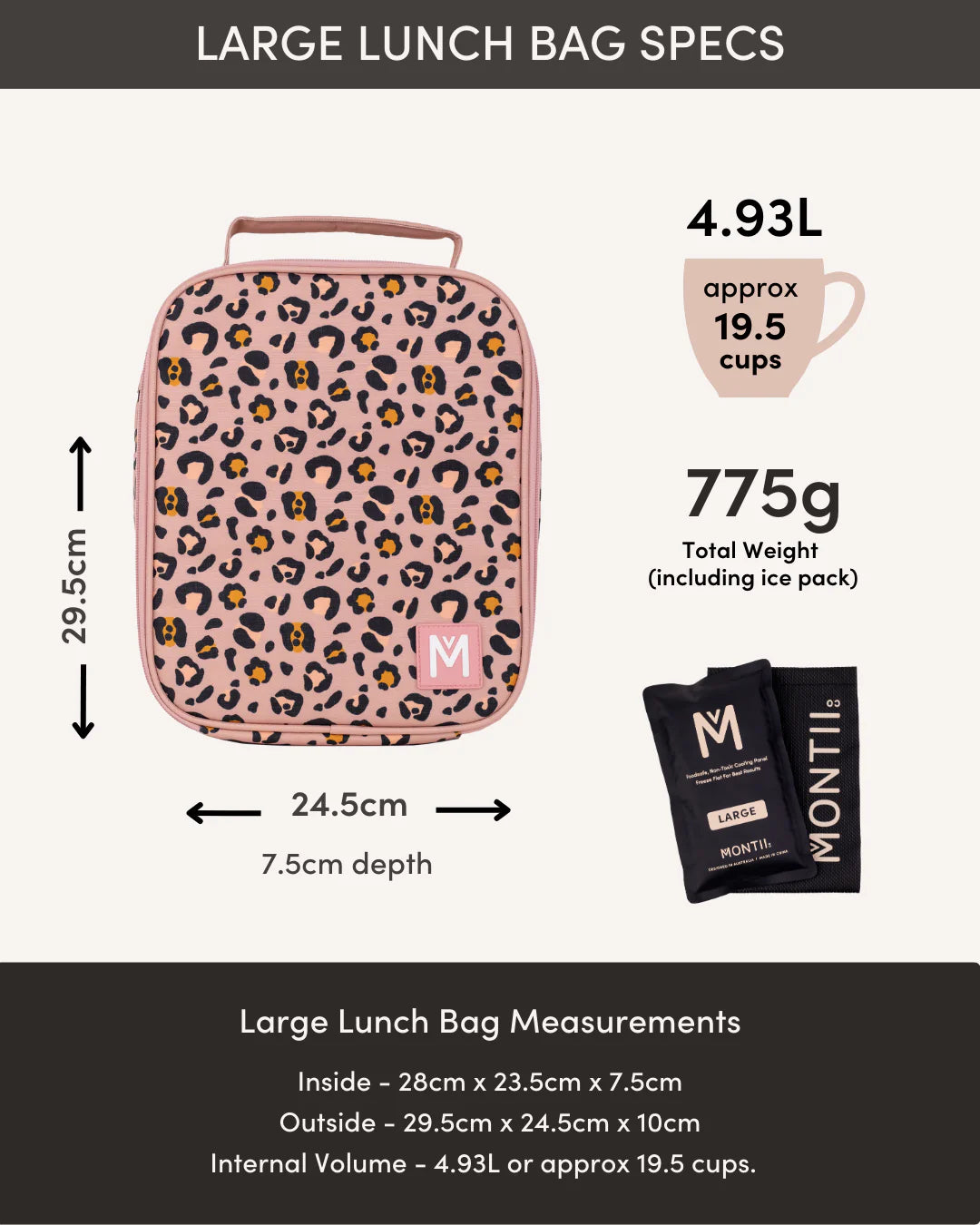 Køletasken kommer med et stort rum som åbnes og lukkes med lynlås. Bagtil er der et andet rum med plads til køleposen. I alle MontiiCo køletasker medfølger en ispose. MontiiCo ispose er selvfølgelig certificeret fødevaresikker. Den kommer i sit eget sorte cover, og kan nemt vaskes. Tasken er lavet i vandafvisende sig og er nemt at tørre af.