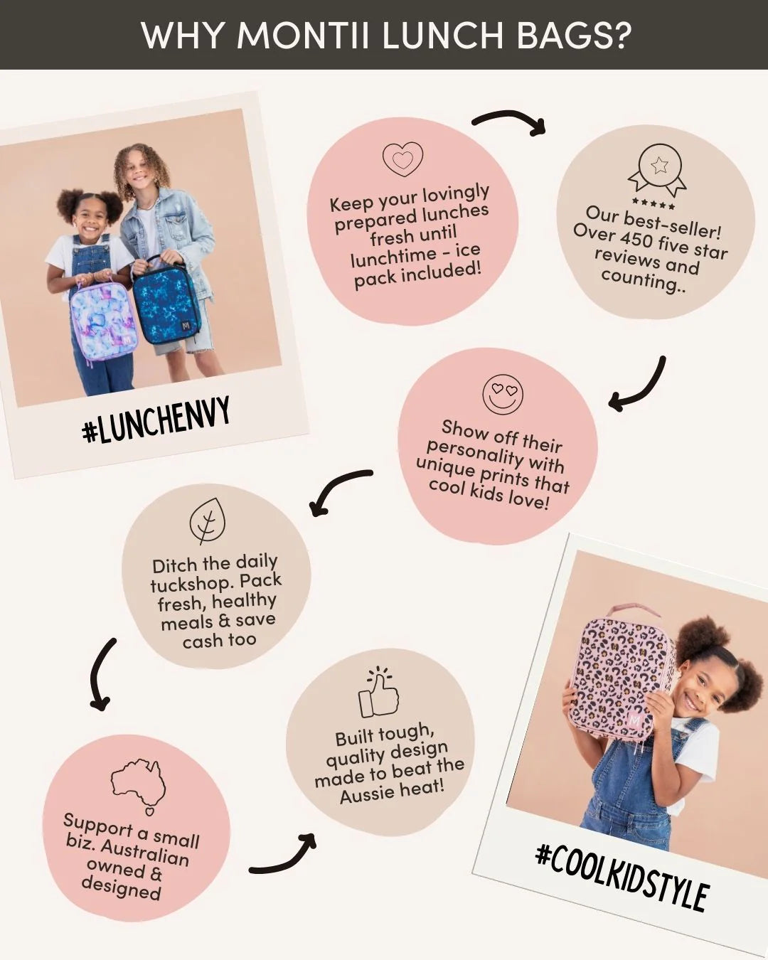 Køletasken kommer med et stort rum som åbnes og lukkes med lynlås. Bagtil er der et andet rum med plads til køleposen. I alle MontiiCo køletasker medfølger en ispose. MontiiCo ispose er selvfølgelig certificeret fødevaresikker. Den kommer i sit eget sorte cover, og kan nemt vaskes. Tasken er lavet i vandafvisende sig og er nemt at tørre af.