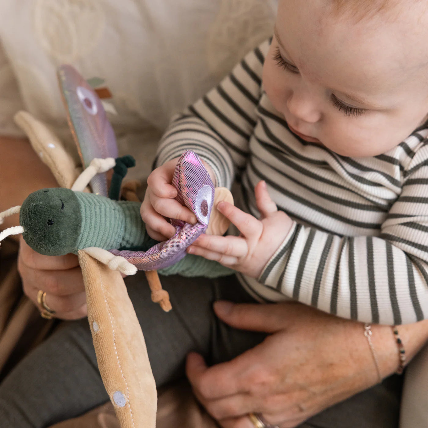 Aktivitetslegetøj formet som en blød og raslende guldsmed – klar til at underholde og stimulere babyens sanser fra første blik. Guldsmeden kan nemt hænges op i barnevognen, autostolen eller over aktivitetstæppet og er fyldt med små detaljer, der indbyder til leg og udforskning.