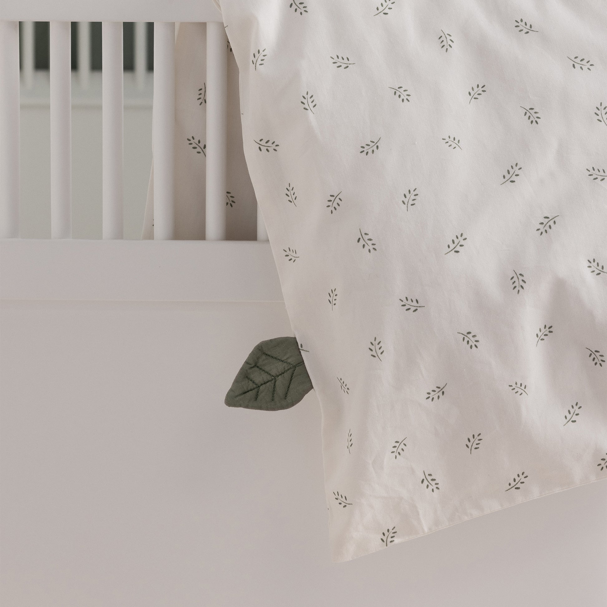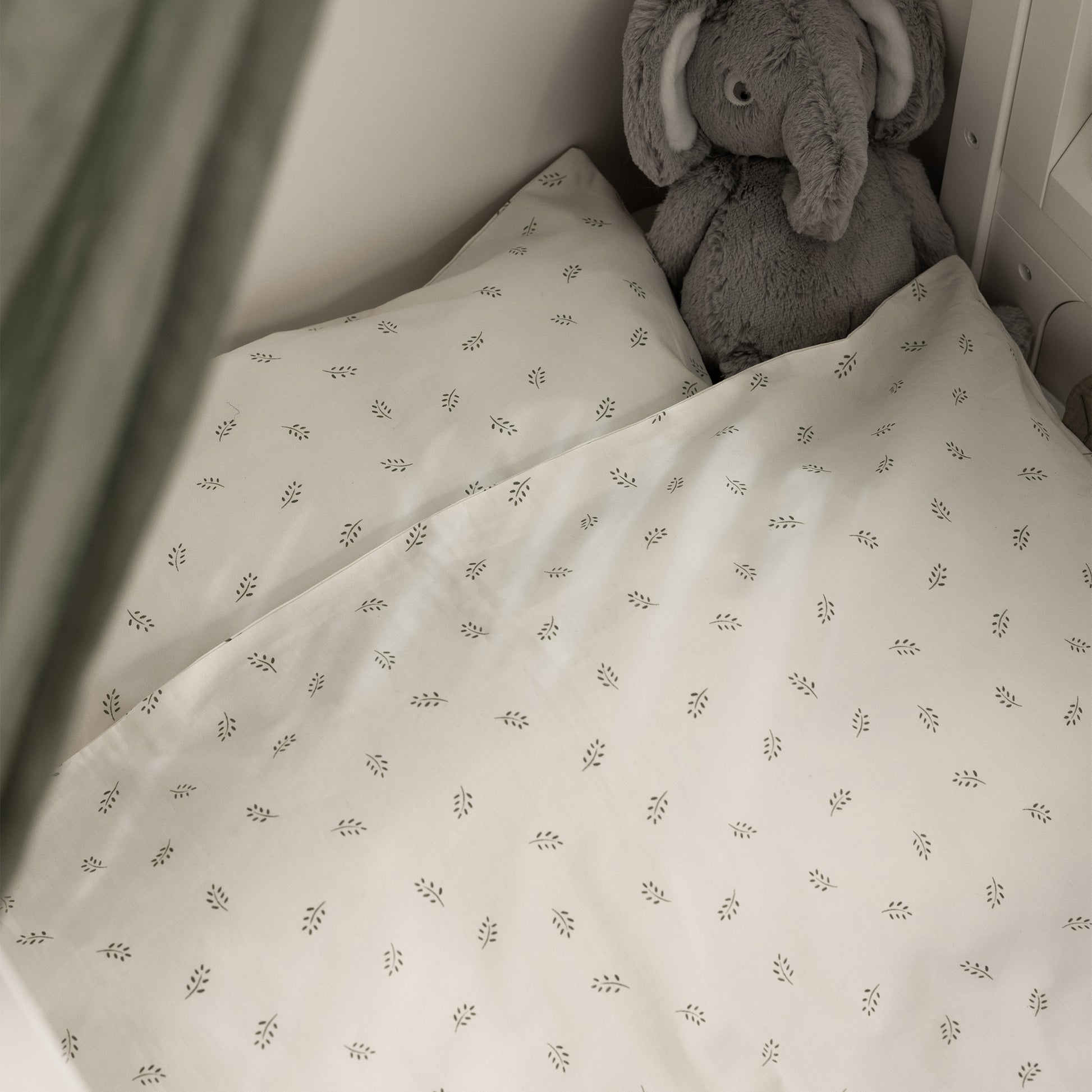 Sengetøjet indeholder dynebetræk og hovedpudebetræk i babystørrelse. Med en god YKK-lynlås, der er skjult, så den ikke generer søvnen. Som en ekstra detalje har dynebetrækket et lille blad påsyet, der fungerer som nulreflap til små søvnige fingre.