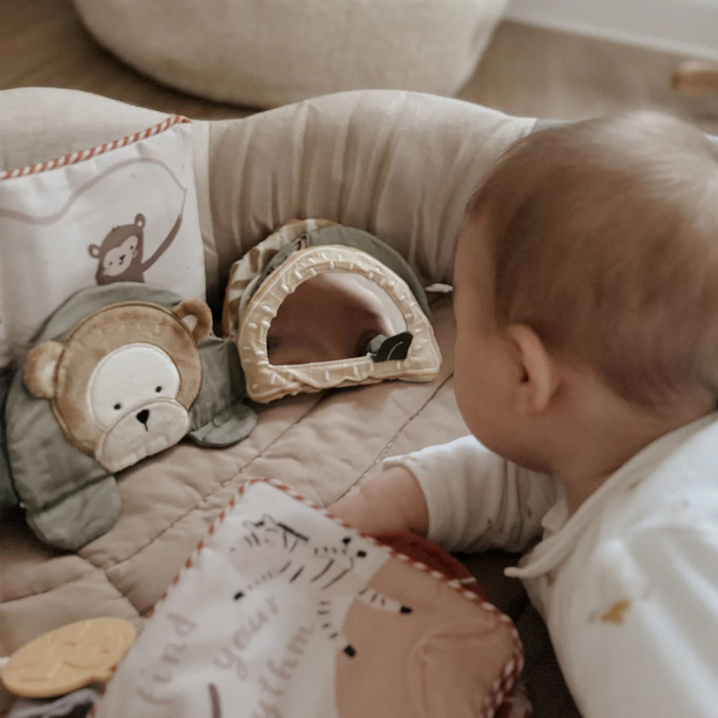 På de bløde sider finder I et hav af detaljer, der stimulerer alle barnets sanser. Hver side har sit eget design og sjove aktiviteter, som eksempelvis et babysikkert spejl, nulreflapper og knitre-stof, der gør bogen underholdende for barnet.